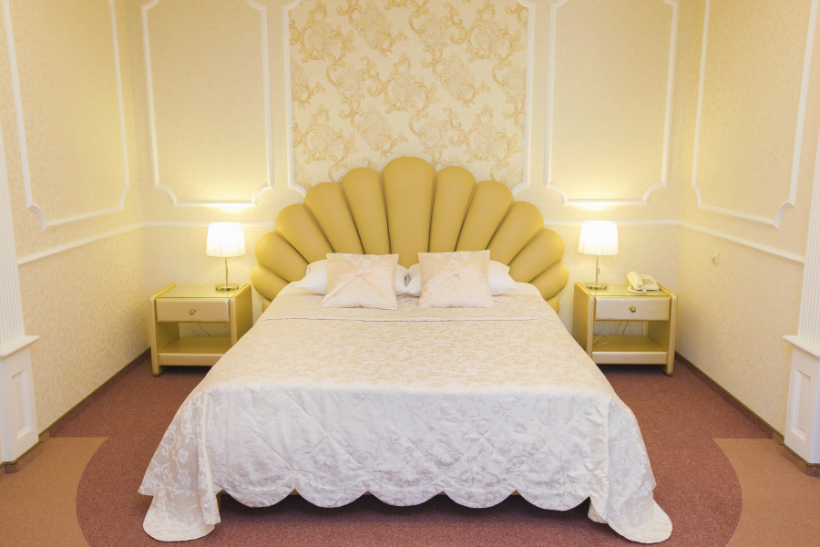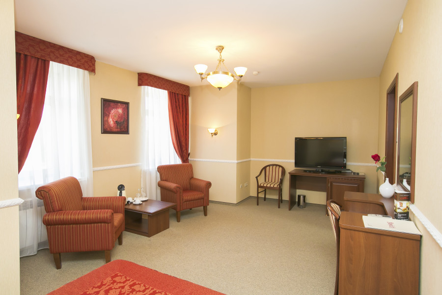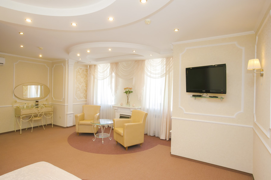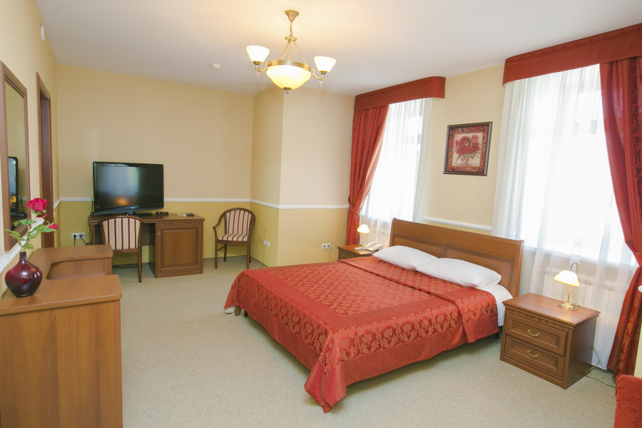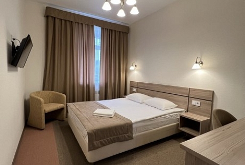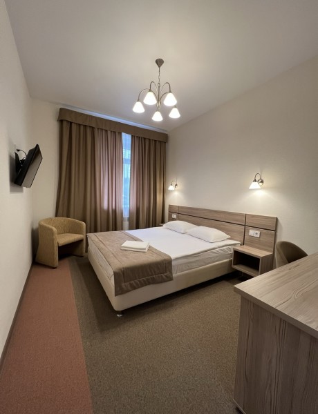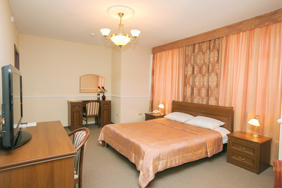 В номере: кровать двуспальная, прикроватные тумбочки, стол, стулья, шкаф, телевизор, телефон
