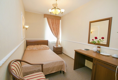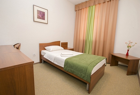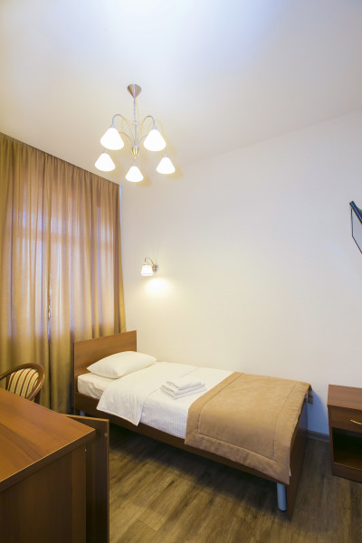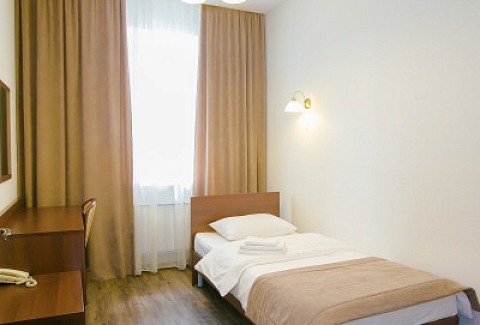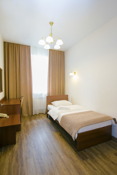 В номере: кровать односпальная, прикроватная тумбочка, стол, стул, телевизор, телефон