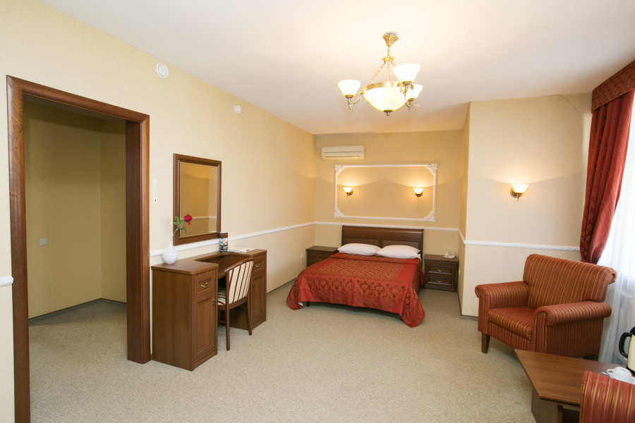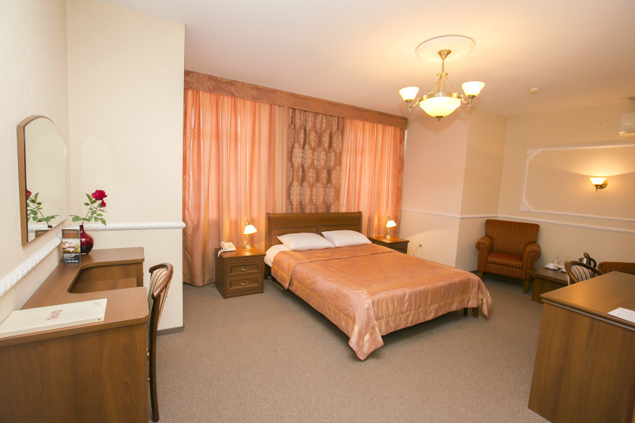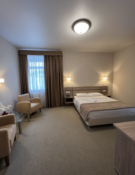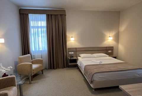 В номере: кровать двуспальная, прикроватные тумбочки, стол, стулья, шкаф, кондиционер, телевизор, телефон, чайная станция