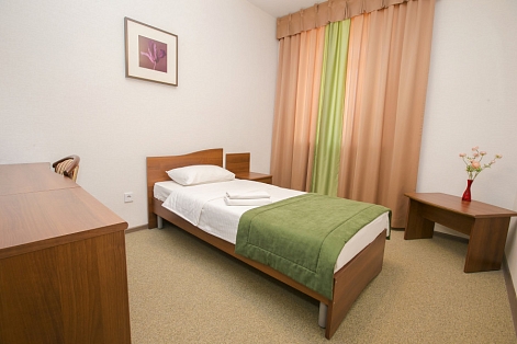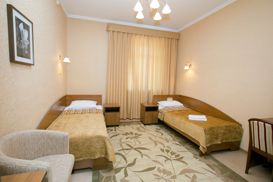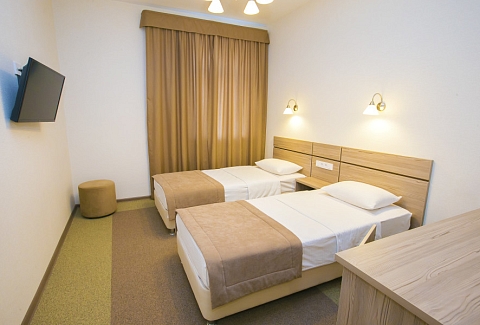 В номере: кровати односпальные, прикроватные тумбочки, стол, стулья, шкаф, телевизор, телефон