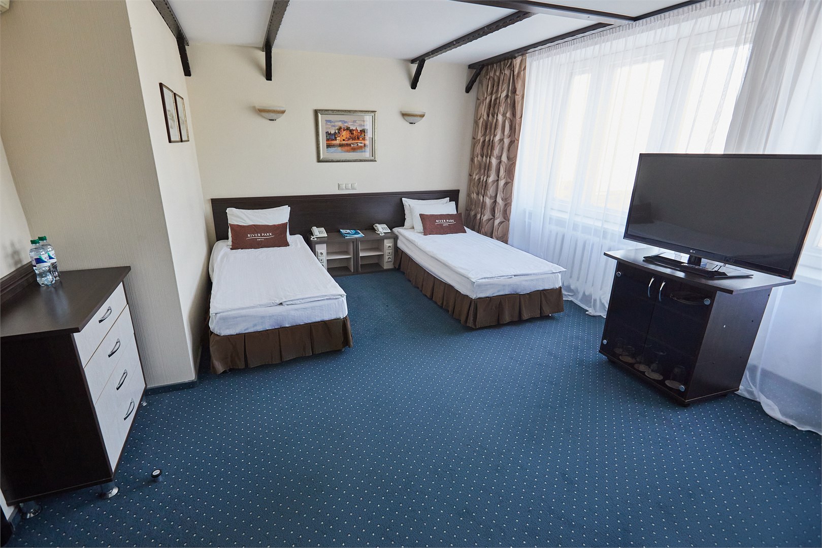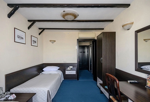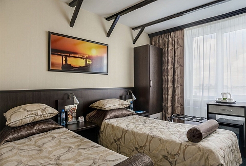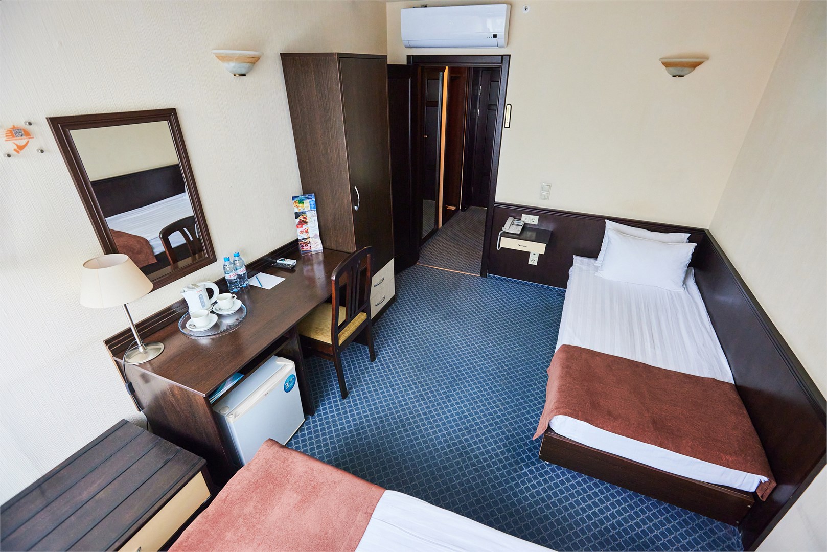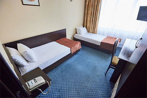 В номере: кровати односпальные, стол, стулья, шкаф, кондиционер, мини-холодильник, телевизор, телефон, чайная станция