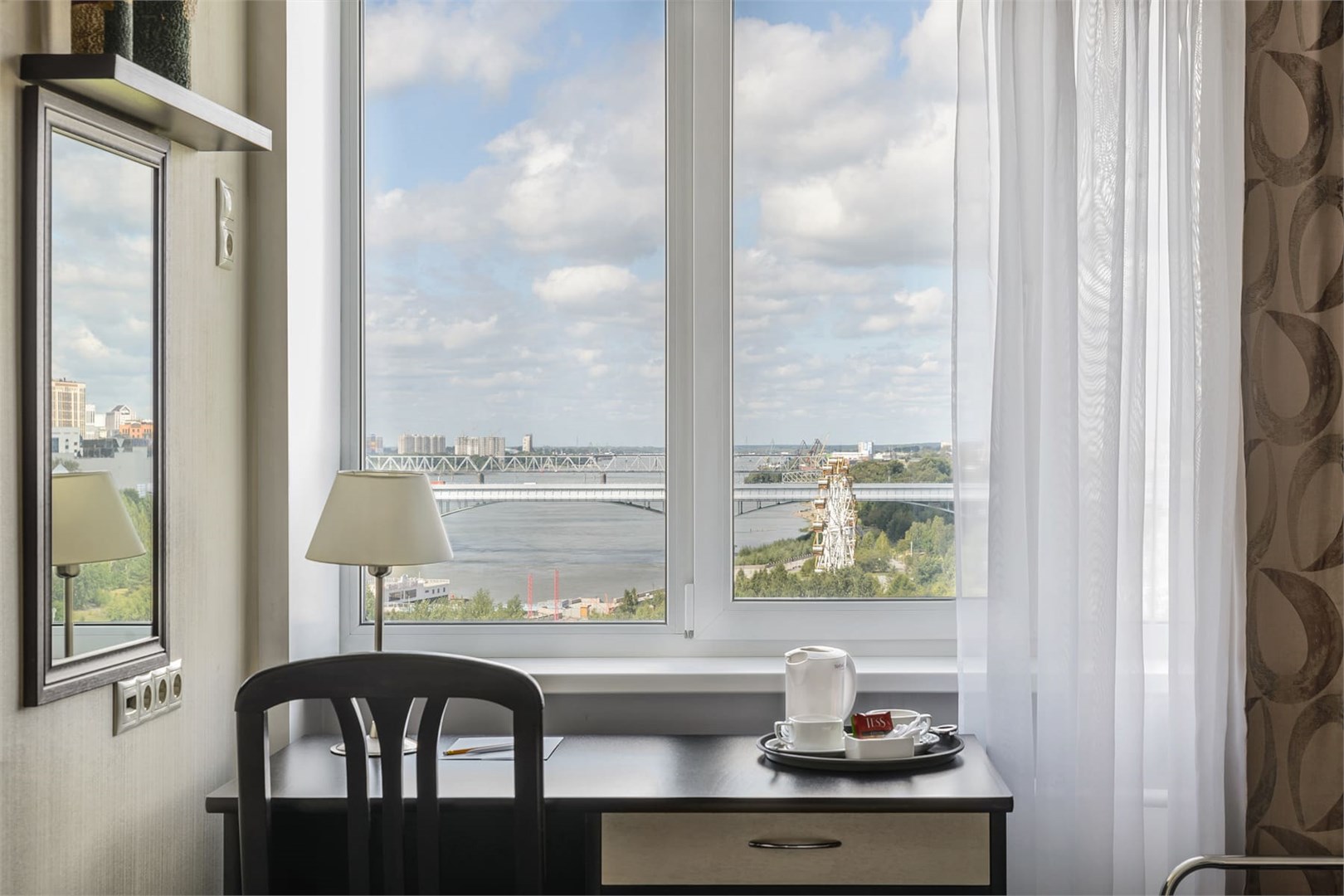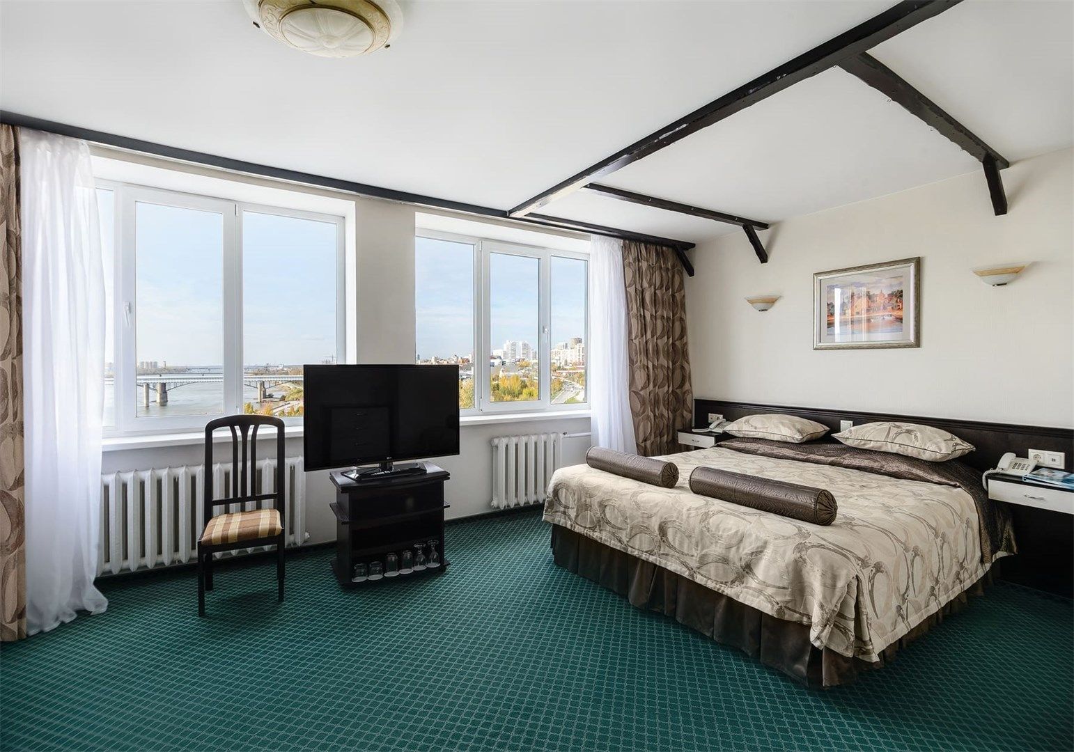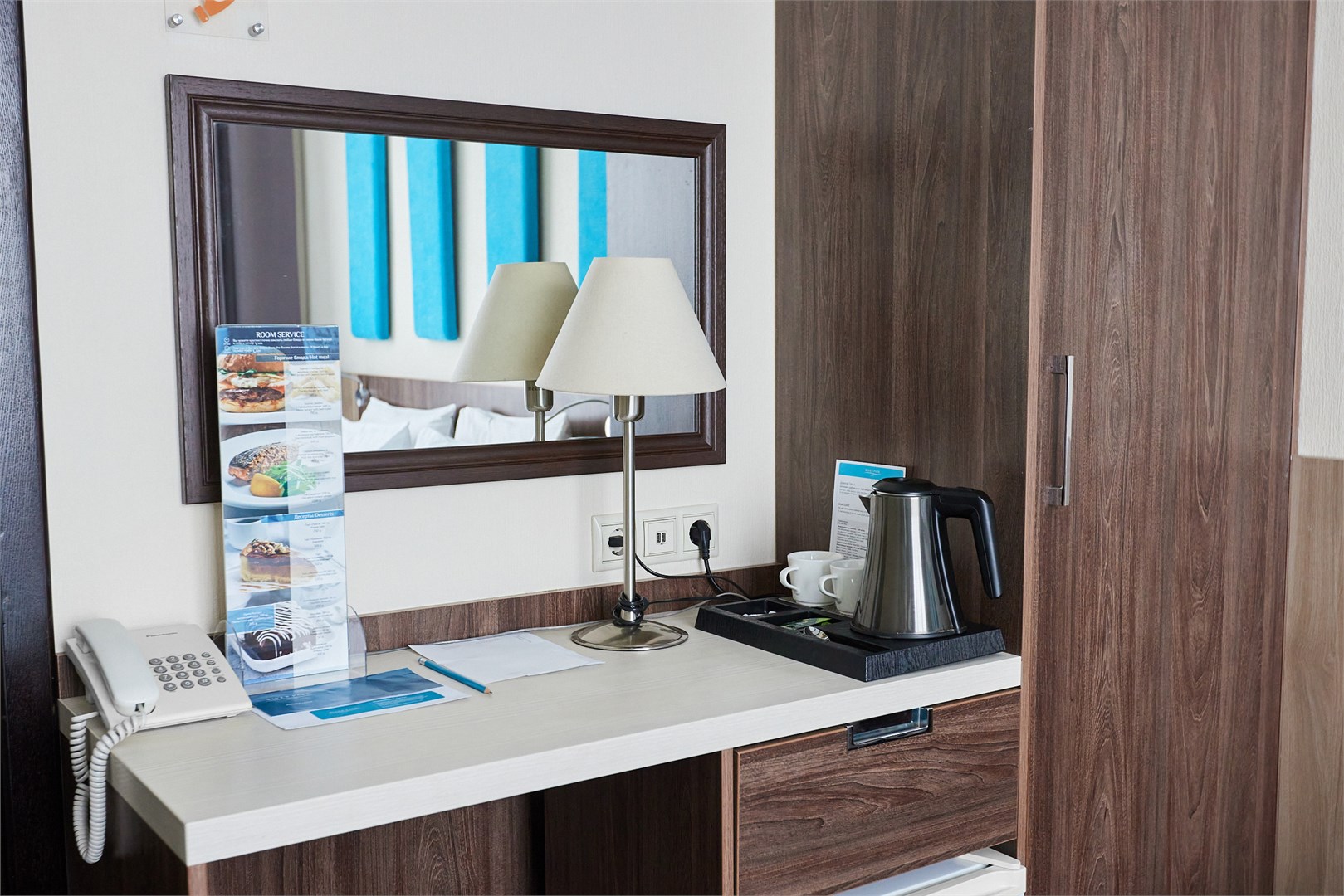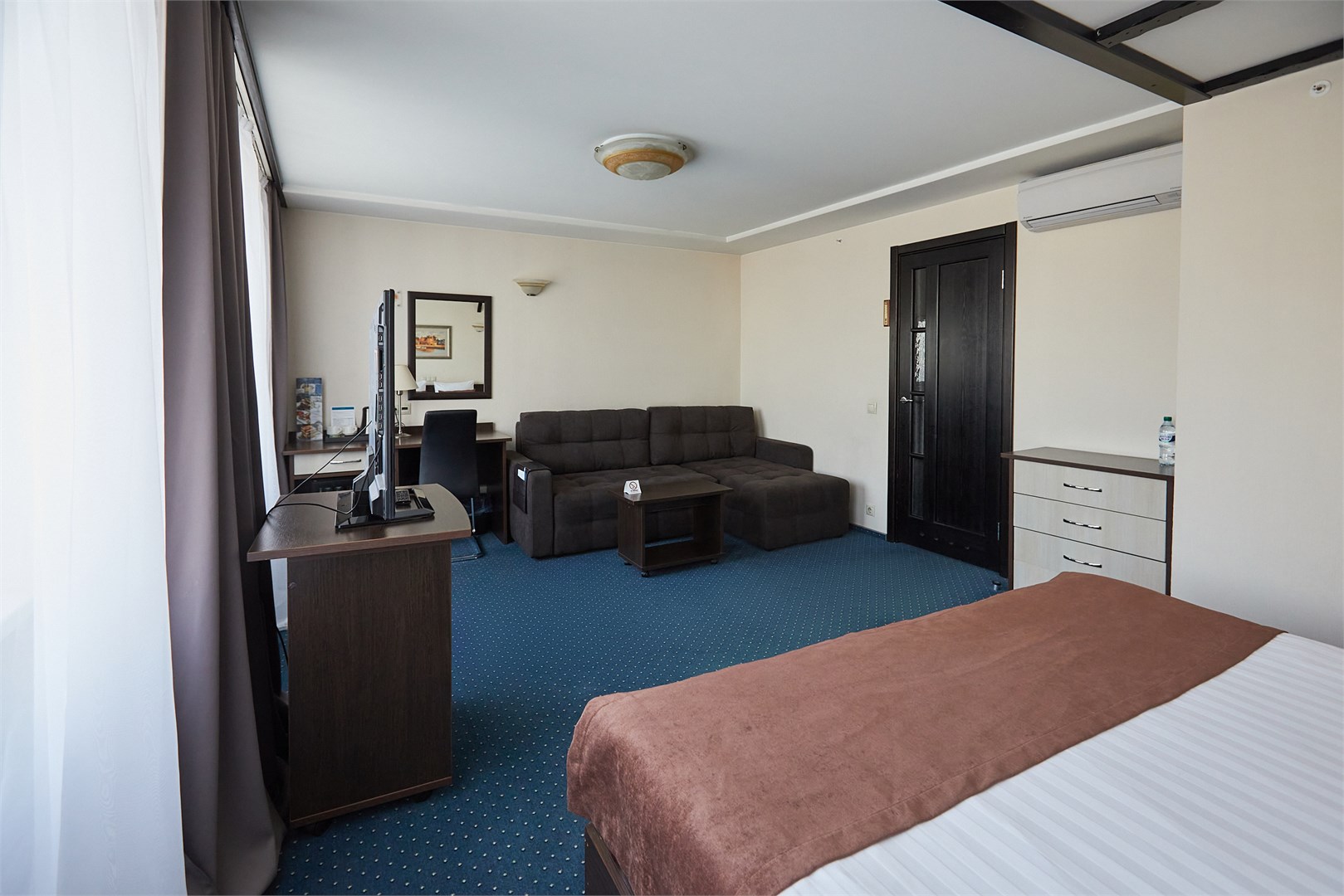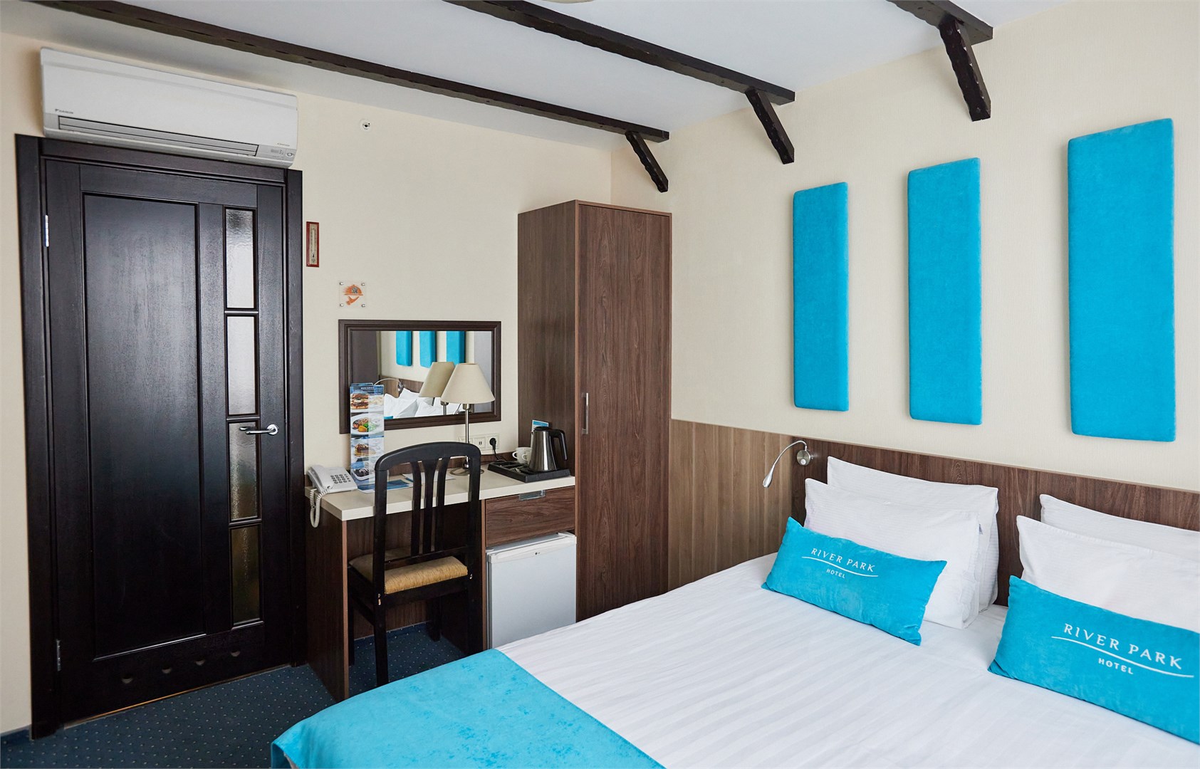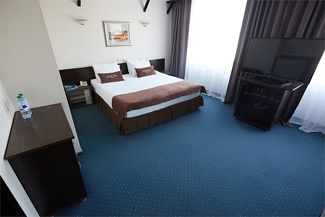 В номере: вешалка, зеркало, кровать двуспальная, прикроватные тумбочки, стол, стулья, шкаф, кондиционер, набор посуды, телевизор, телефон, холодильник, чайный набор посуды, электрочайник