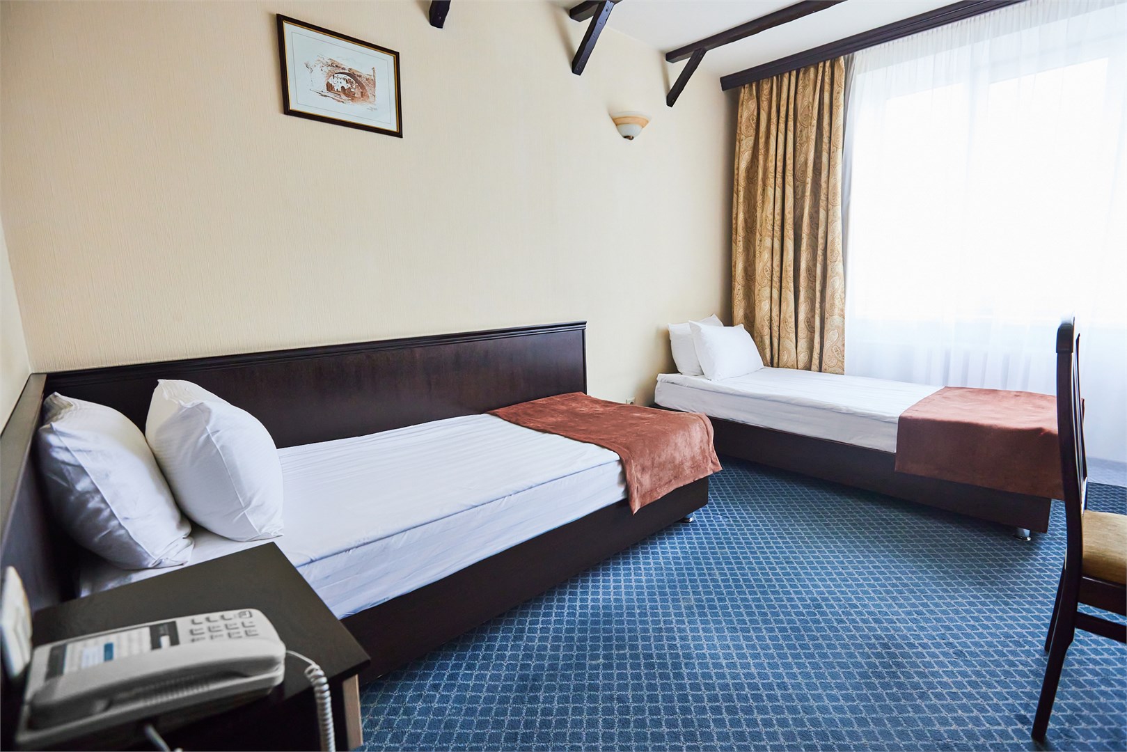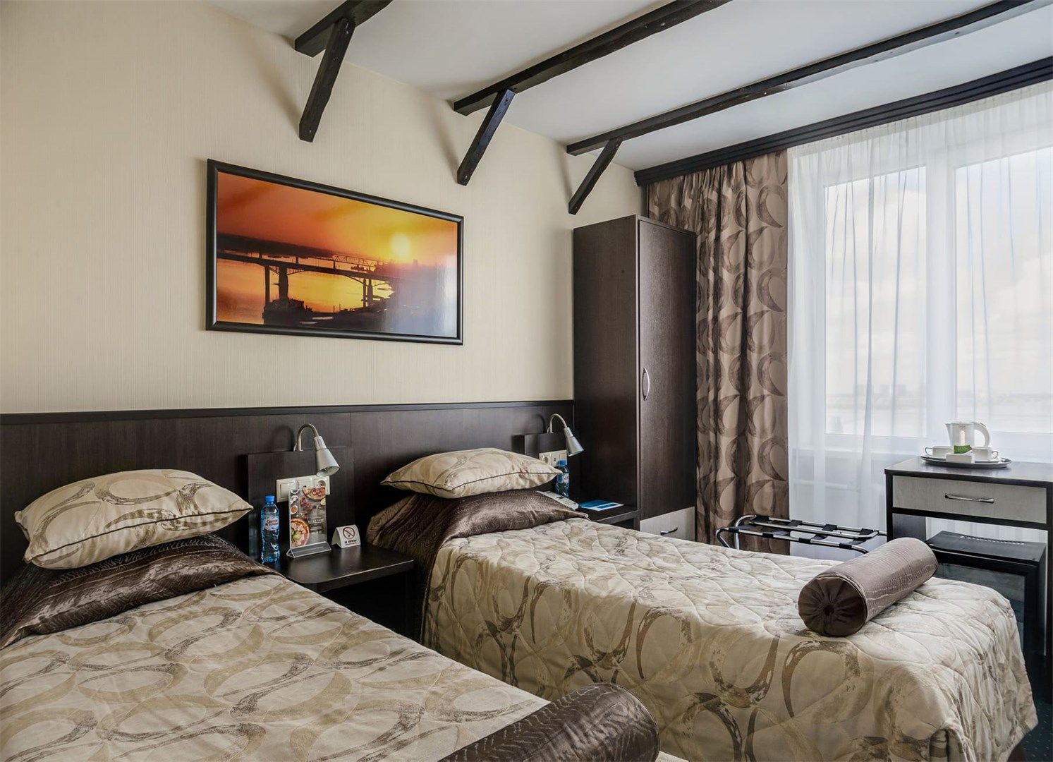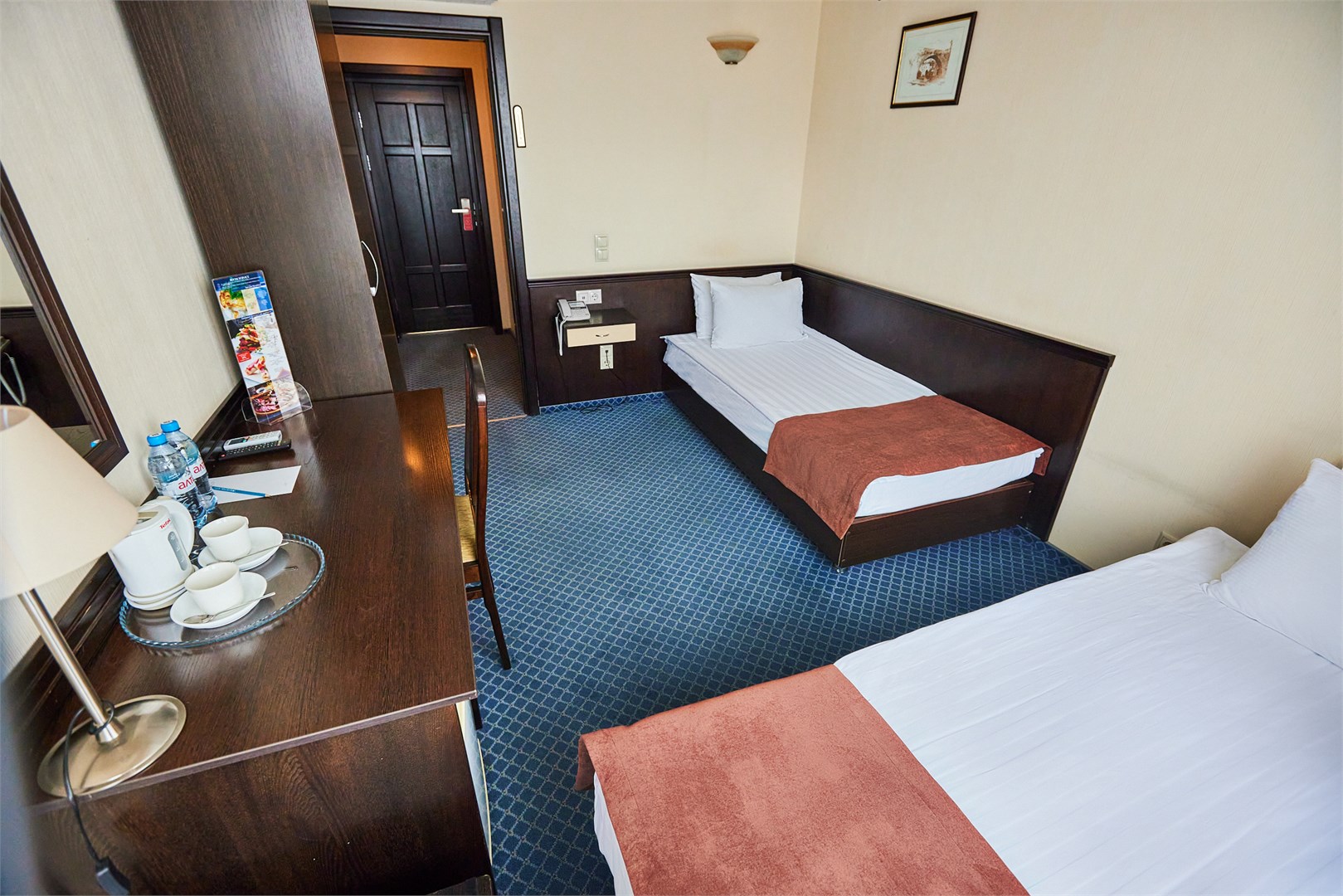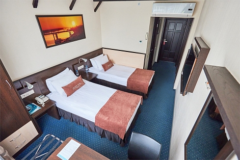 В номере: кровати односпальные, прикроватные тумбочки, стол, стулья, шкаф, кондиционер, телевизор, телефон, чайная станция