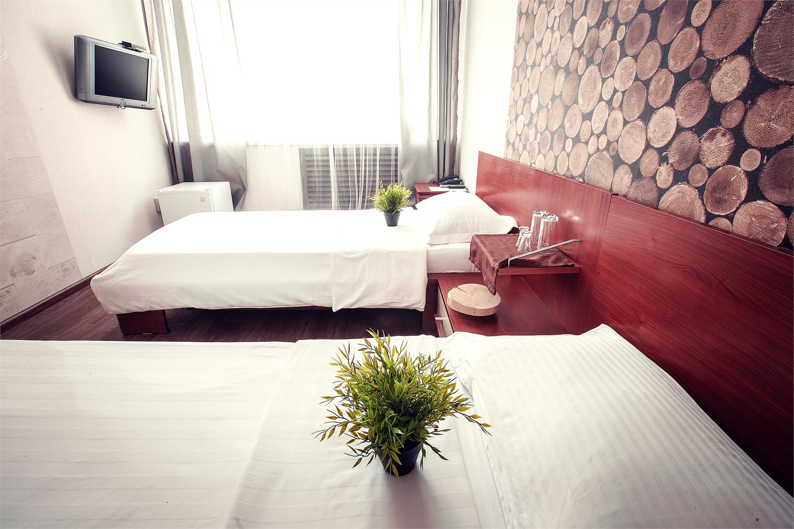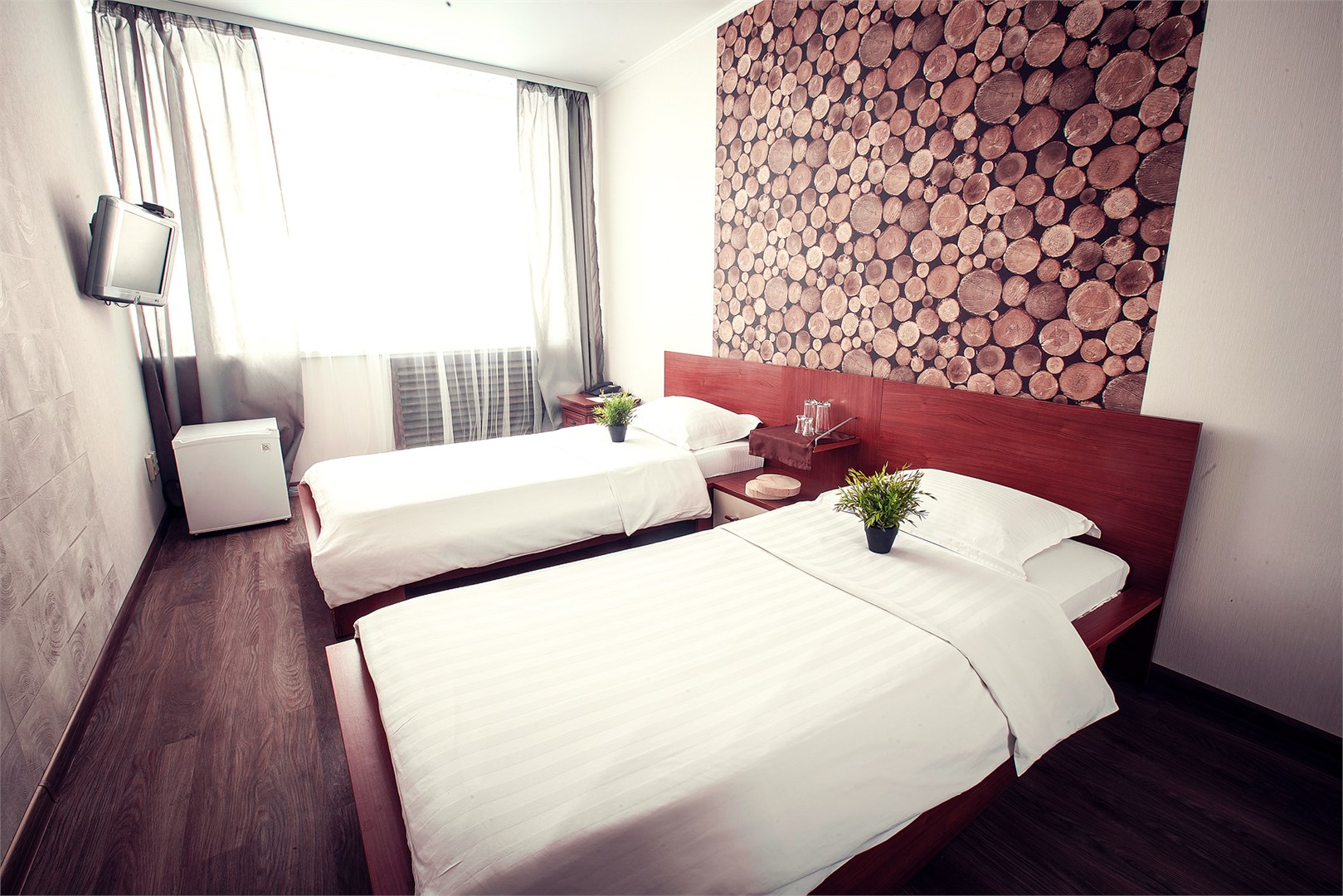 В номере: кровати односпальные, стол, шкаф, телевизор, чайный набор посуды, электрочайник