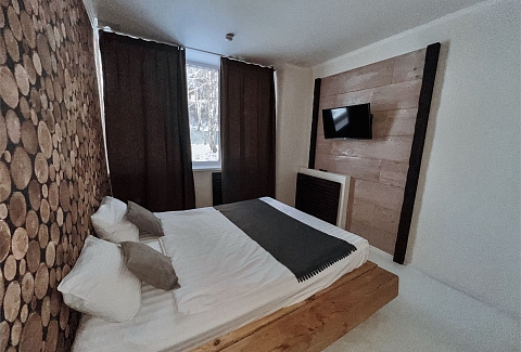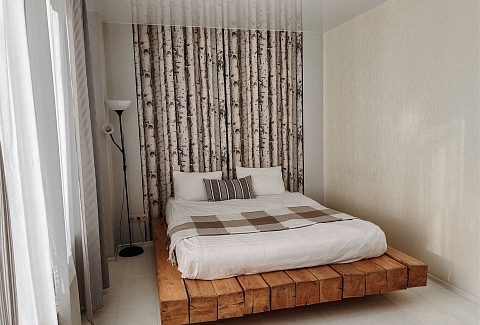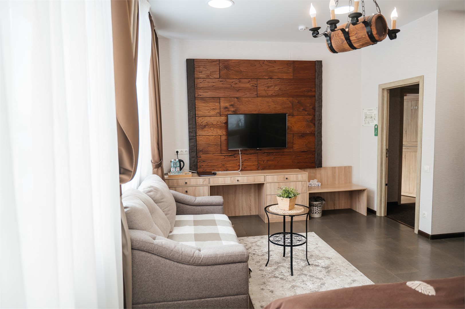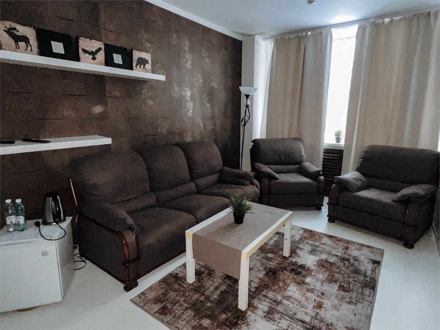 В номере: диван раскладной, кровать двуспальная, столик журнальный, шкаф, телевизор, телефон, холодильник, чайный набор посуды, электрочайник