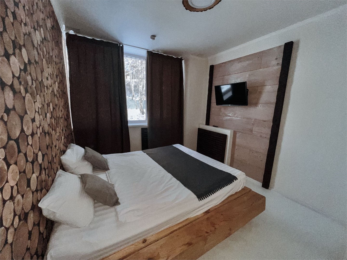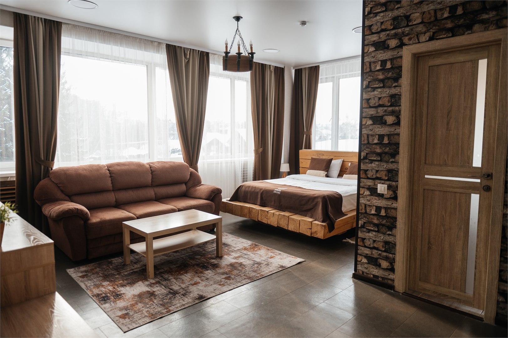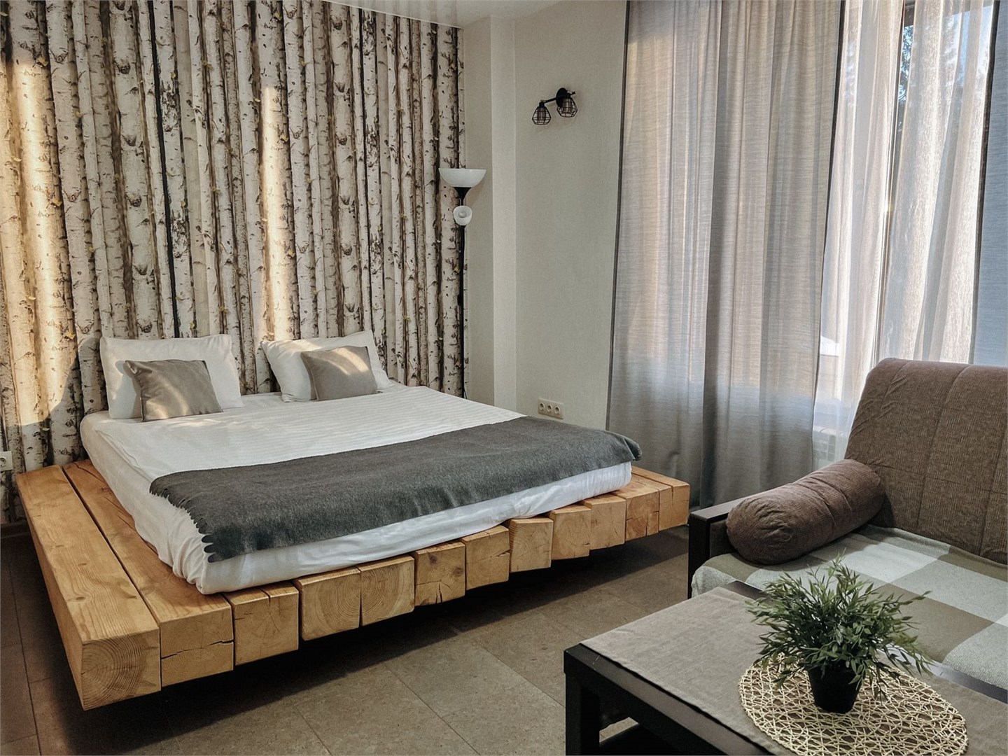 В номере: диван раскладной, кровать двуспальная, столик журнальный, шкаф, телевизор, телефон, холодильник, чайный набор посуды, электрочайник