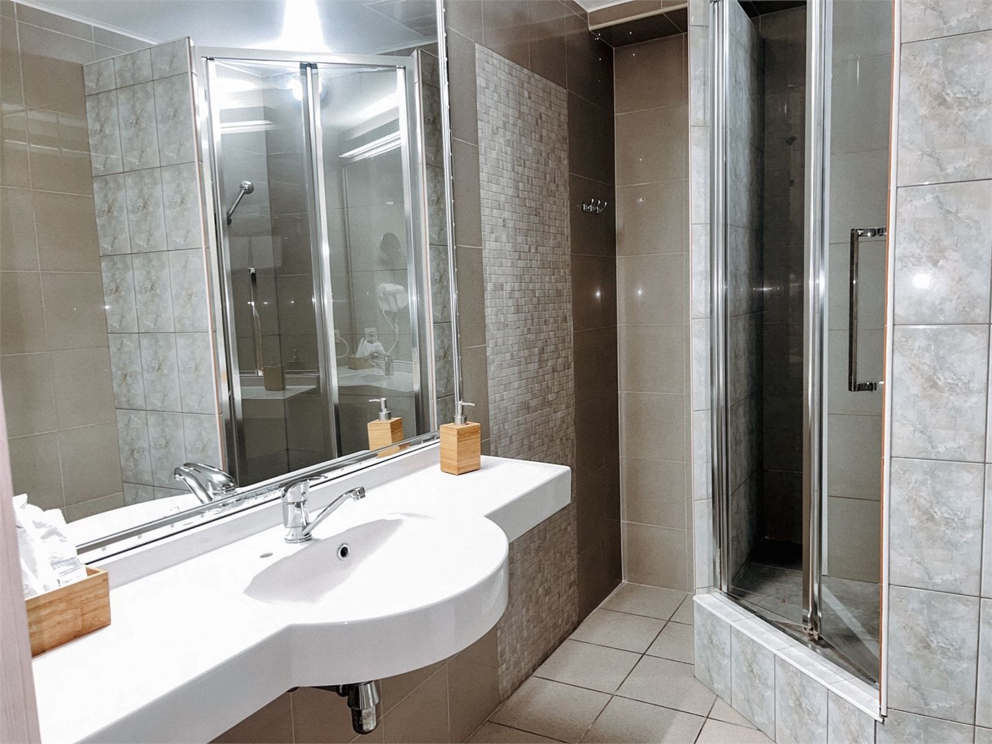 Санузел: с душевой кабиной, тапочки, туалетные принадлежности, фен, халат