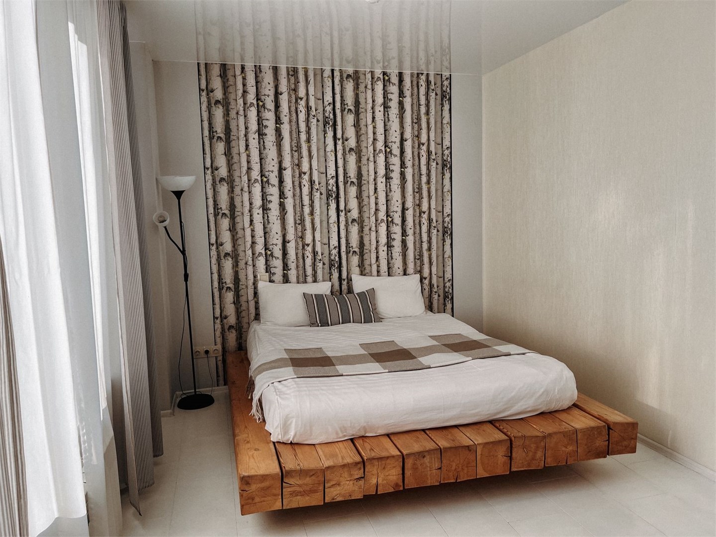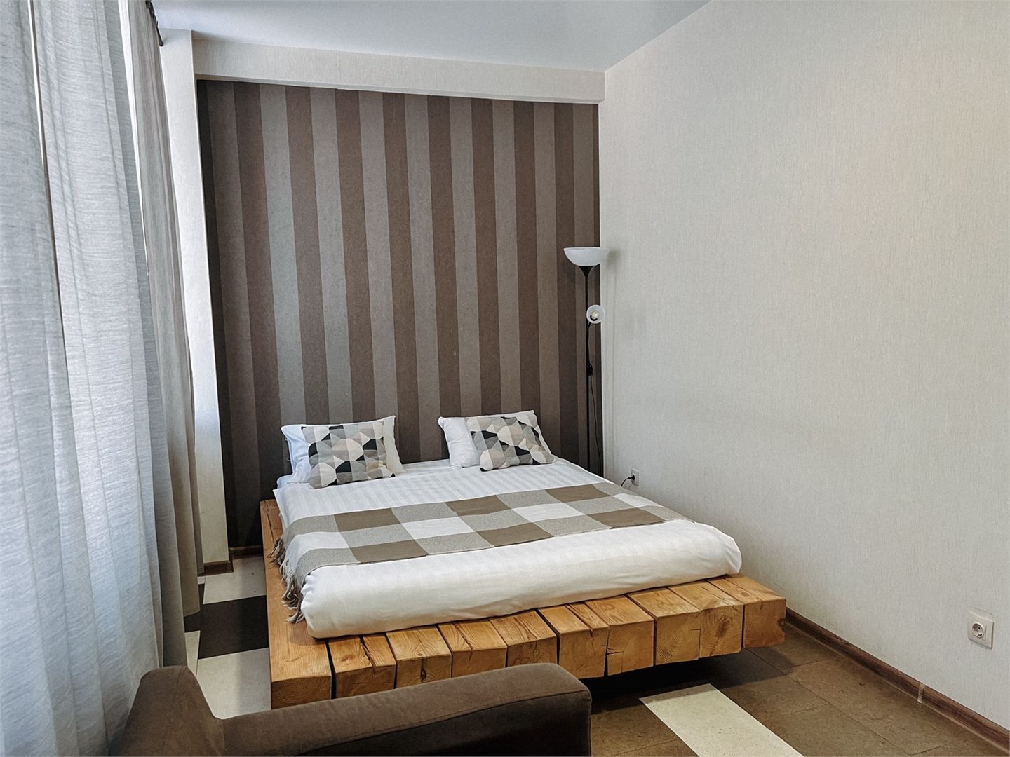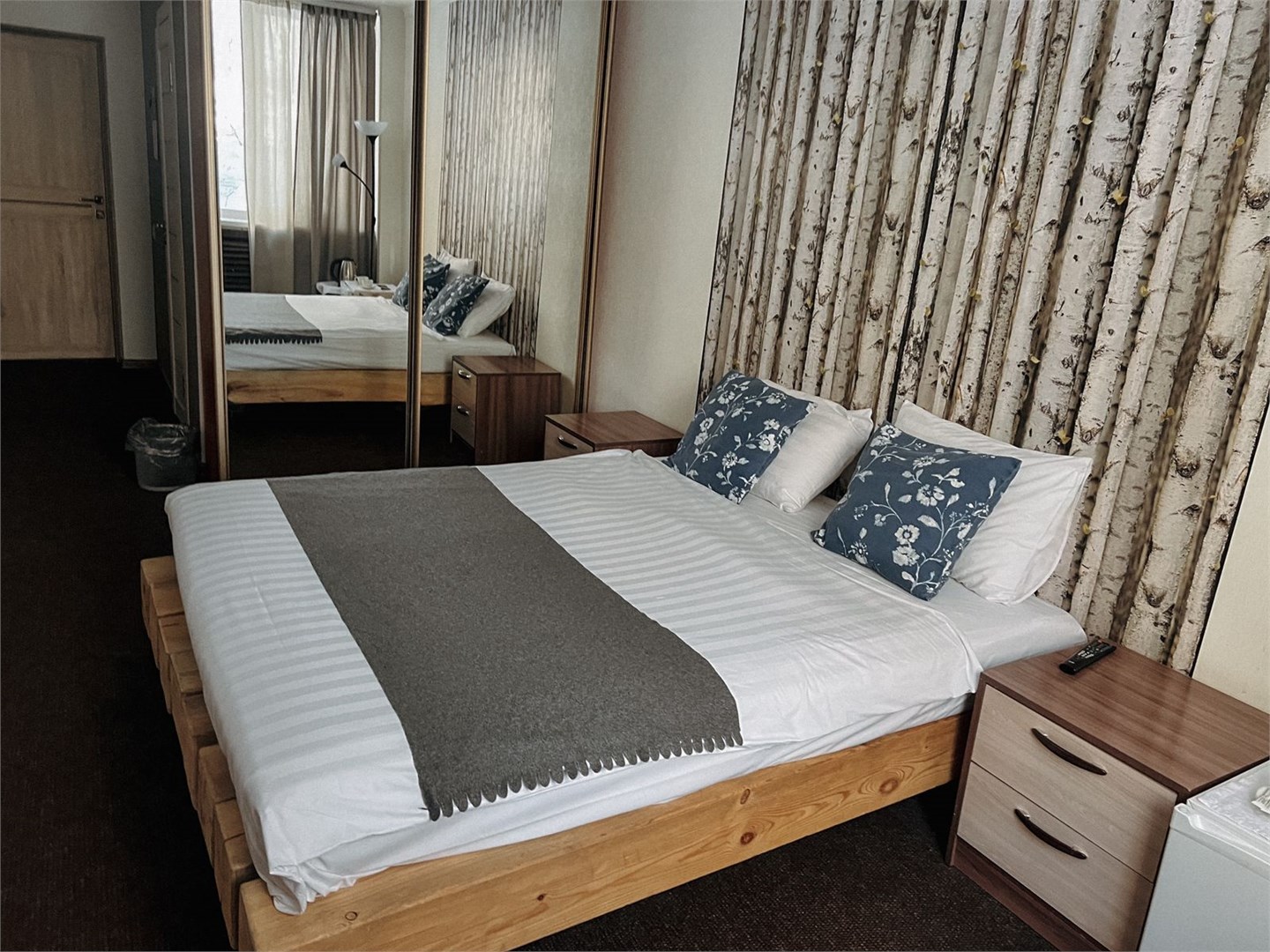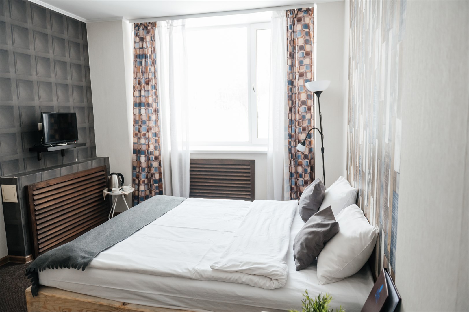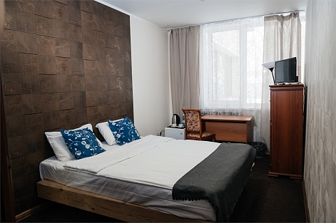 В номере: кровать двуспальная, прикроватные тумбочки, стол, стул, шкаф, телевизор, телефон, холодильник, чайный набор посуды, электрочайник