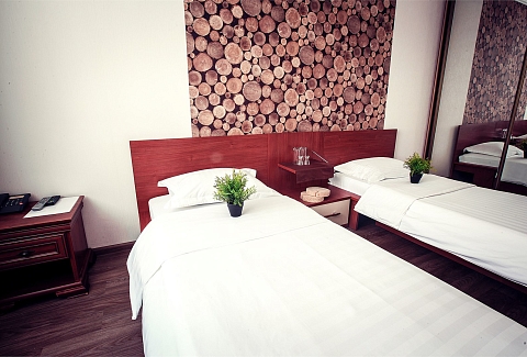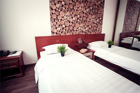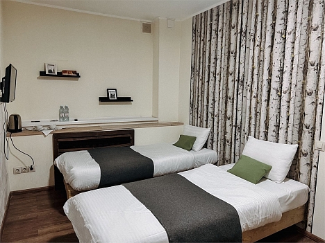 В номере: кровати односпальные /одна двуспальная кровать, прикроватные тумбочки, стол, стулья, шкаф, телевизор, телефон, холодильник, чайный набор посуды, электрочайник