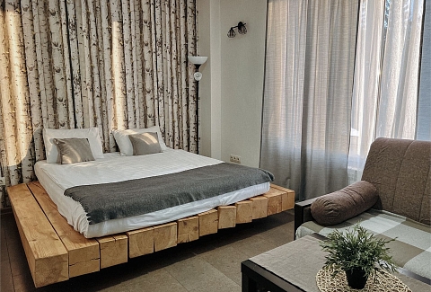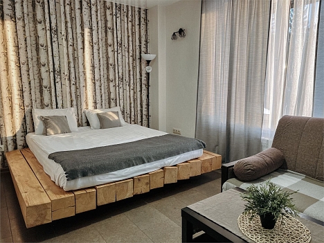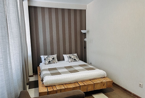 В номере: диван раскладной, кровать двуспальная, столик журнальный, шкаф, кондиционер, телевизор, телефон, холодильник, чайный набор посуды, электрочайник
