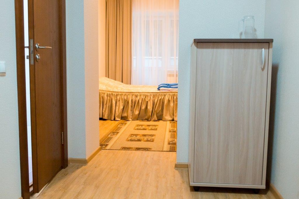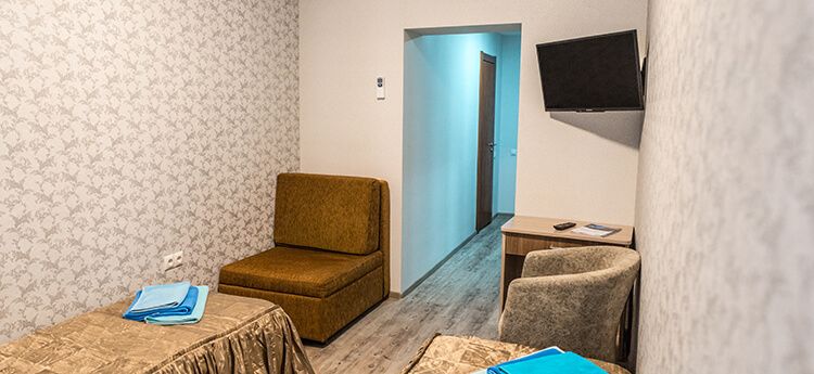 В номере: вешалка, зеркало, кровати полутороспальные, прикроватные тумбочки, стол, стулья, шкаф, кондиционер, набор посуды, телевизор, телефон, холодильник, электрочайник