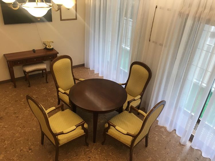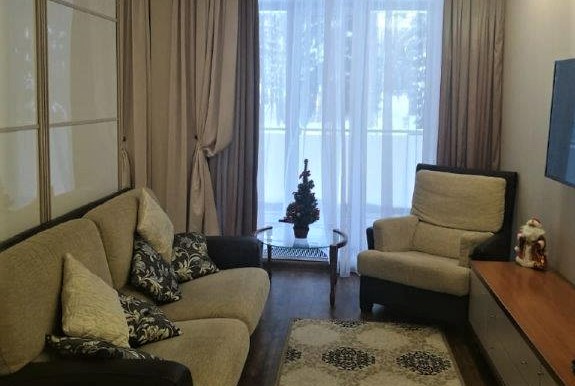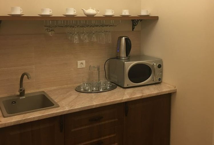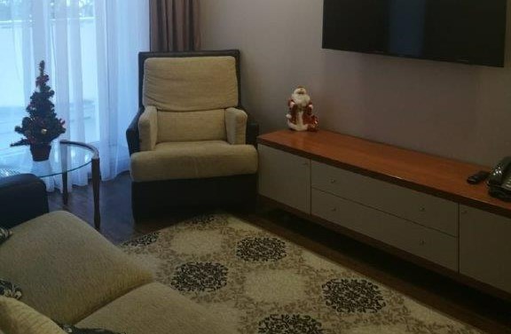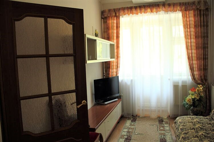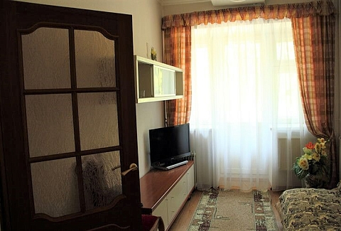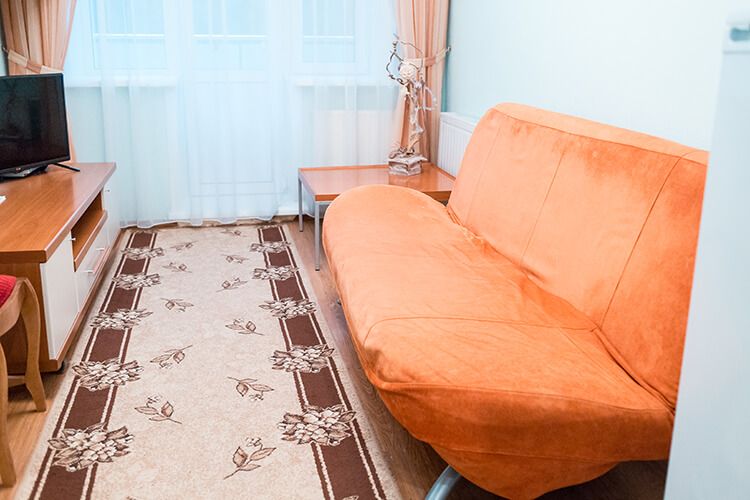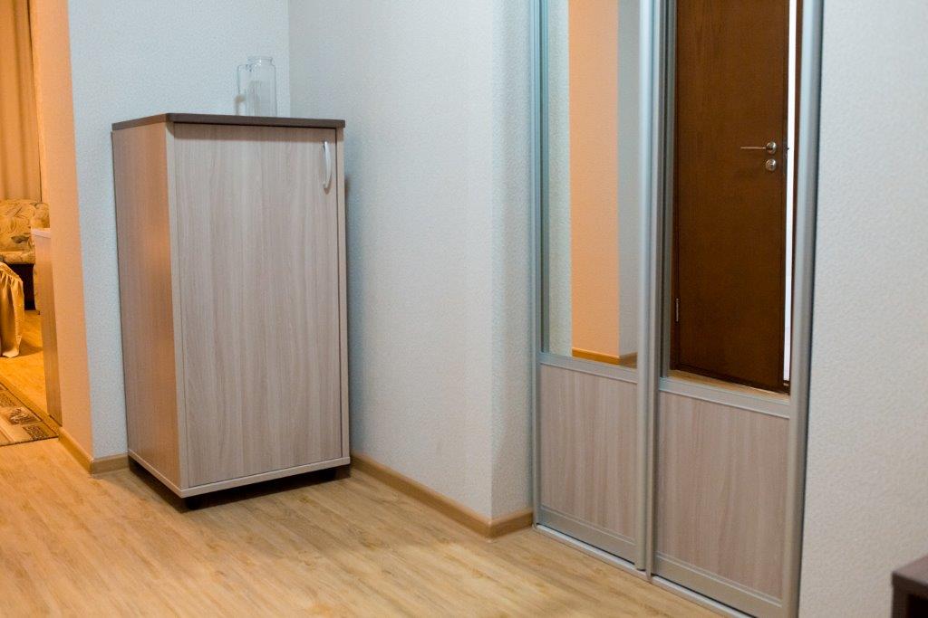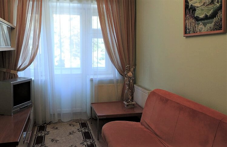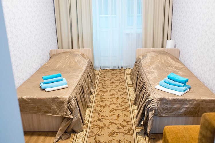 В номере: вешалка, диван, зеркало, кровати полутороспальные, прикроватные тумбочки, стол, стулья, шкаф, кондиционер, микроволновая печь, набор посуды, телевизор, телефон, холодильник, электрочайник