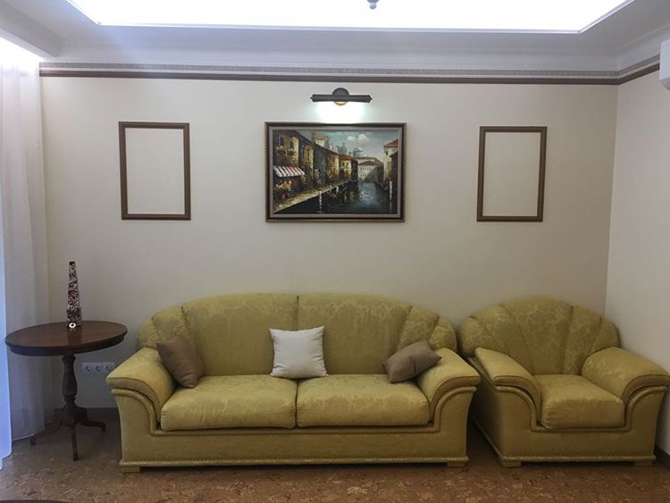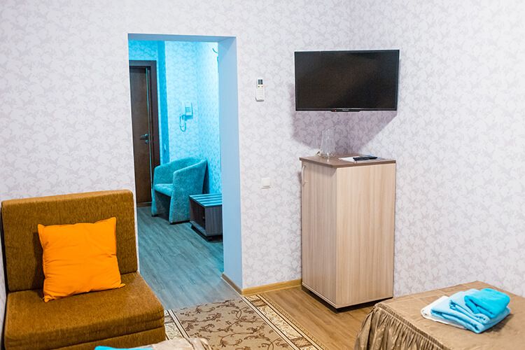 В номере: вешалка, диван, зеркало, кресло, кровати полутороспальные, прикроватные тумбочки, стол, стулья, шкаф, кондиционер, микроволновая печь, набор посуды, телевизор, телефон, холодильник, электрочайник