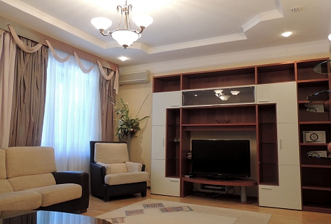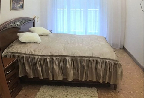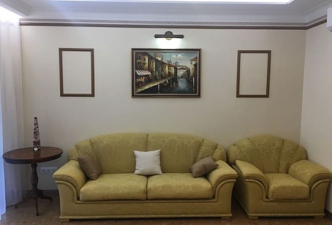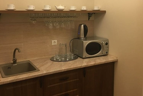 В номере: вешалка, диван, зеркало, кровать двуспальная, прикроватные тумбочки, стол, стулья, шкаф, кондиционер, микроволновая печь, набор посуды, телевизор, телефон, холодильник, электрочайник