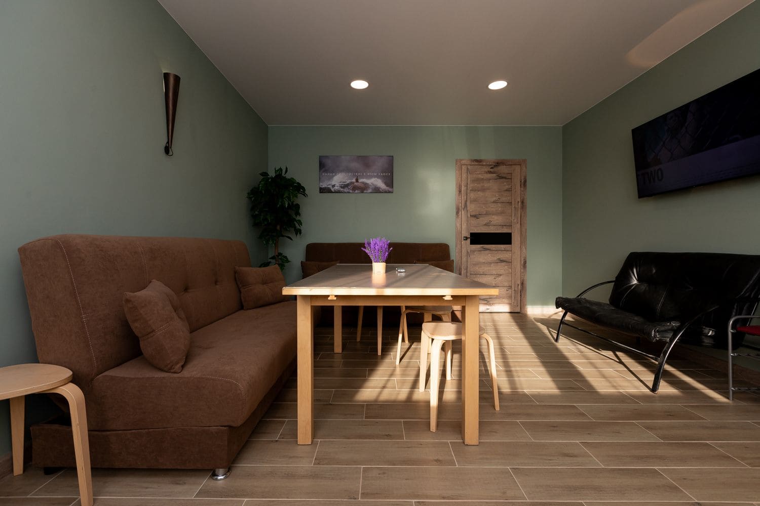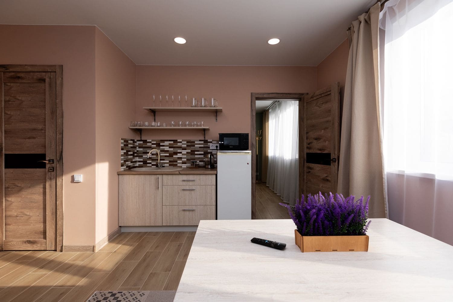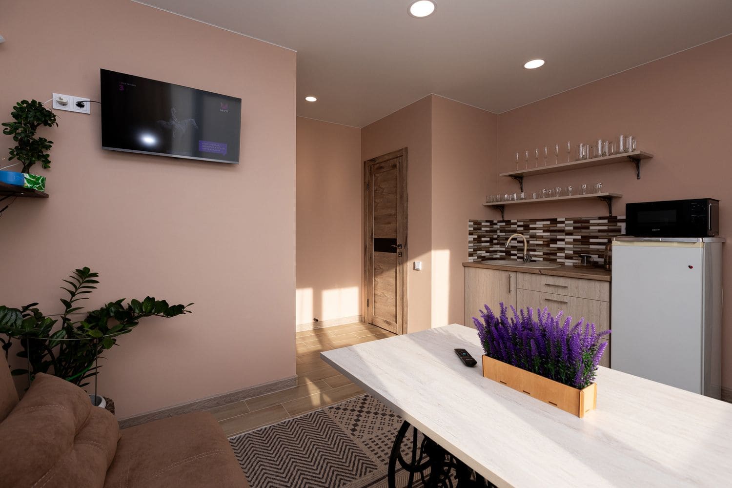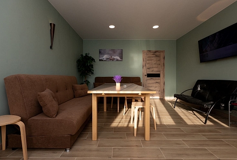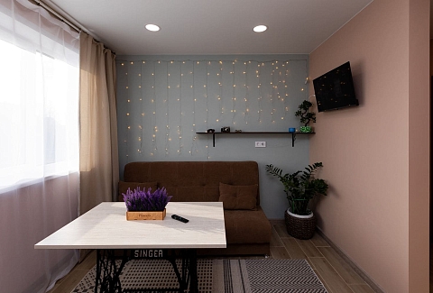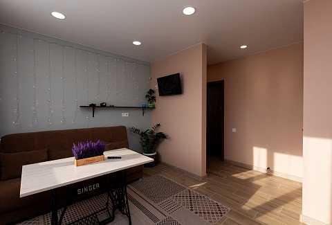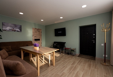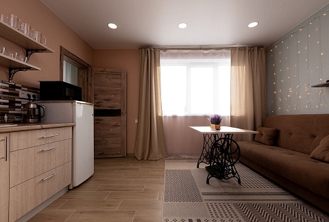 В номере: диван раскладной, кухонная мебель, стол обеденный, стулья, шкаф, микроволновая печь, набор посуды, плита электрическая, телевизор, холодильник, электрочайник