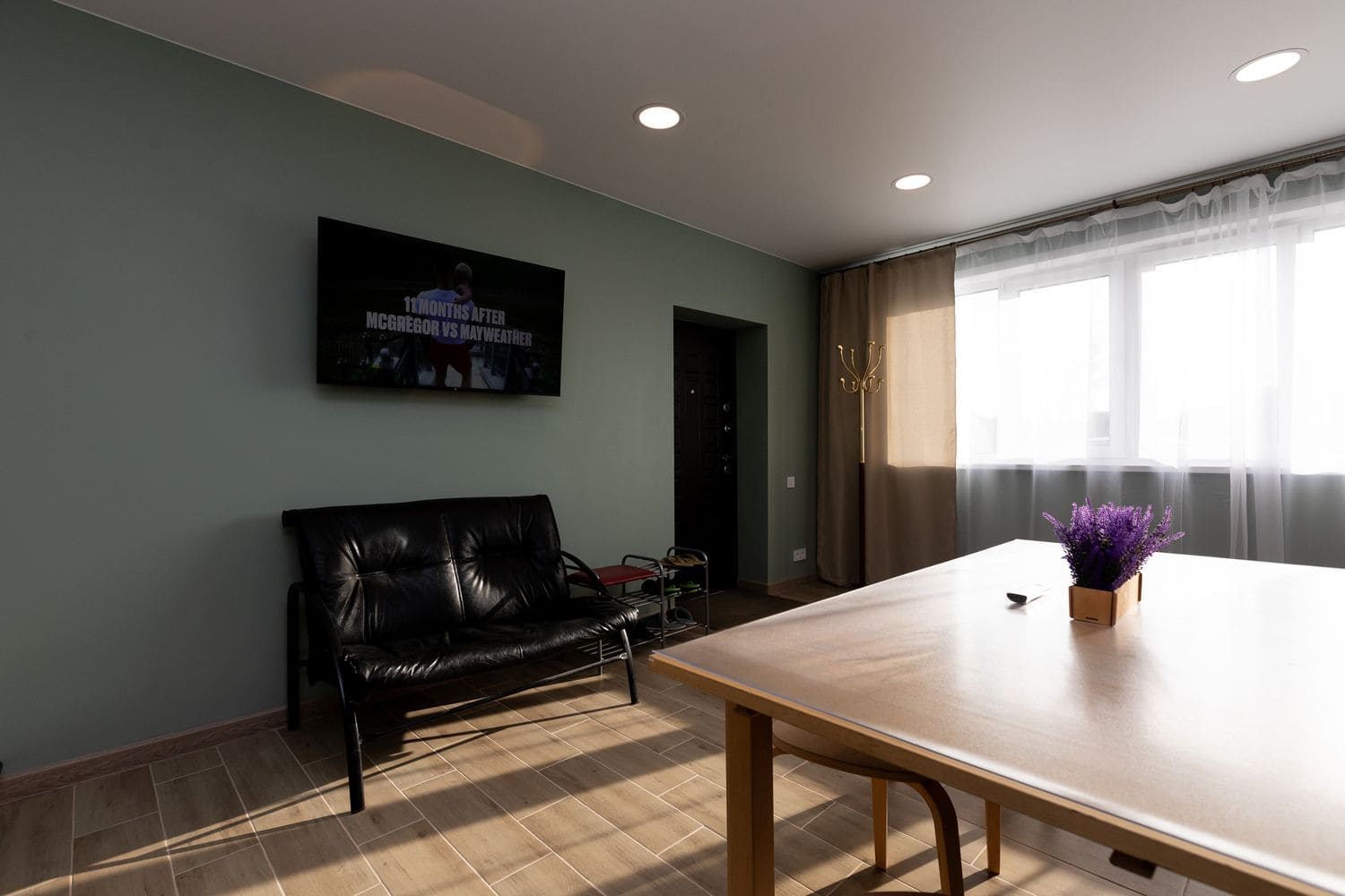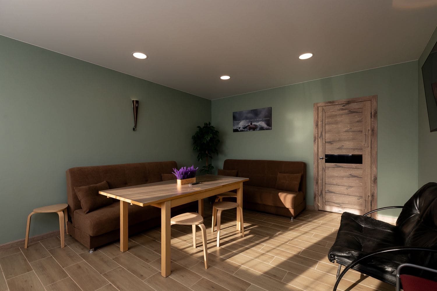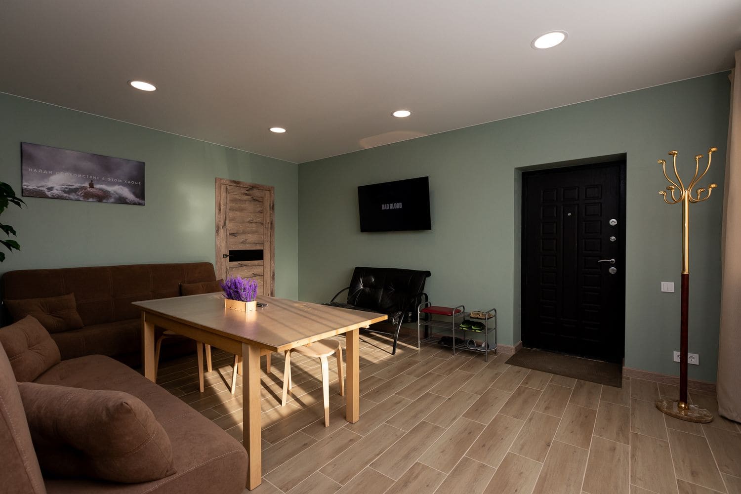 В номере: диван раскладной, кухонная мебель, стол обеденный, стулья, шкаф, микроволновая печь, набор посуды, плита электрическая, телевизор, холодильник, электрочайник