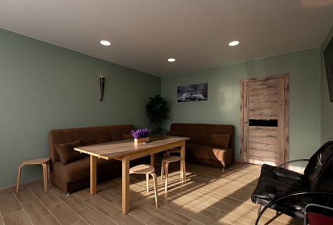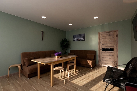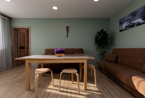 Дом идеально подойдет для тихого семейного отдыха или проведения нешумных мероприятий. Внутри коттеджа две просторных комнаты и спальные места на трех раскладывающихся диванах. Кухня полностью оборудована - выделена обеденная зона, есть необходимая посуда и техника. Санузел с душем, имеется сауна. В доступе беспроводная сеть wi-fi.На территории обустроена мангальная площадка. Для личного транспорта постояльцев организованы парковочные места – три во дворе и еще несколько рядом с домом.