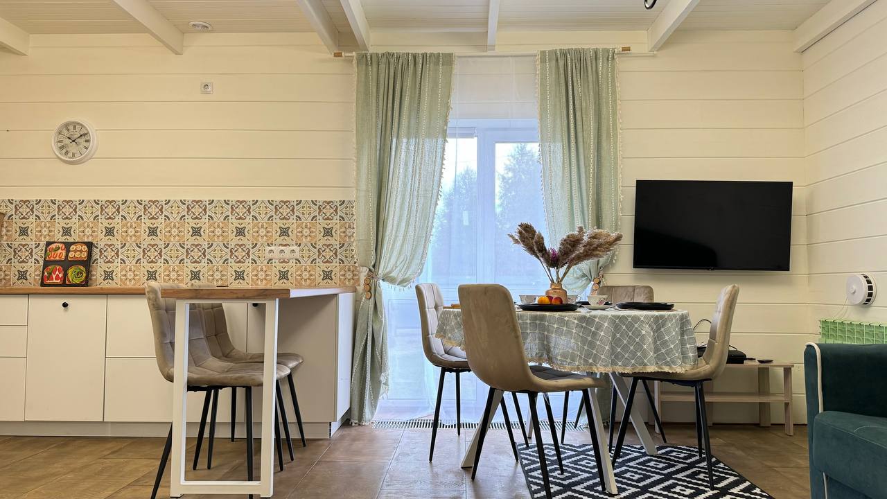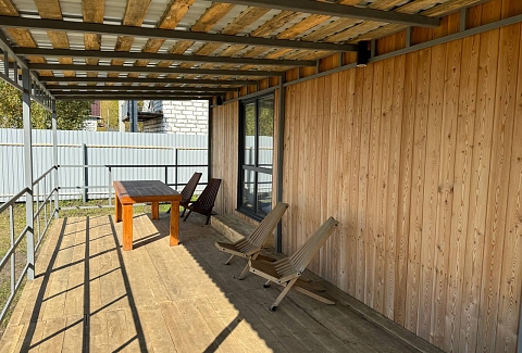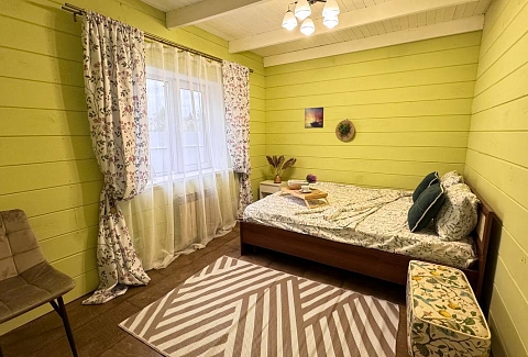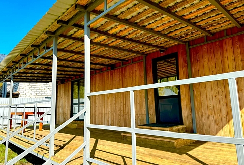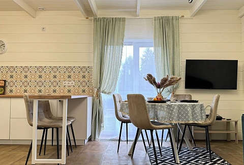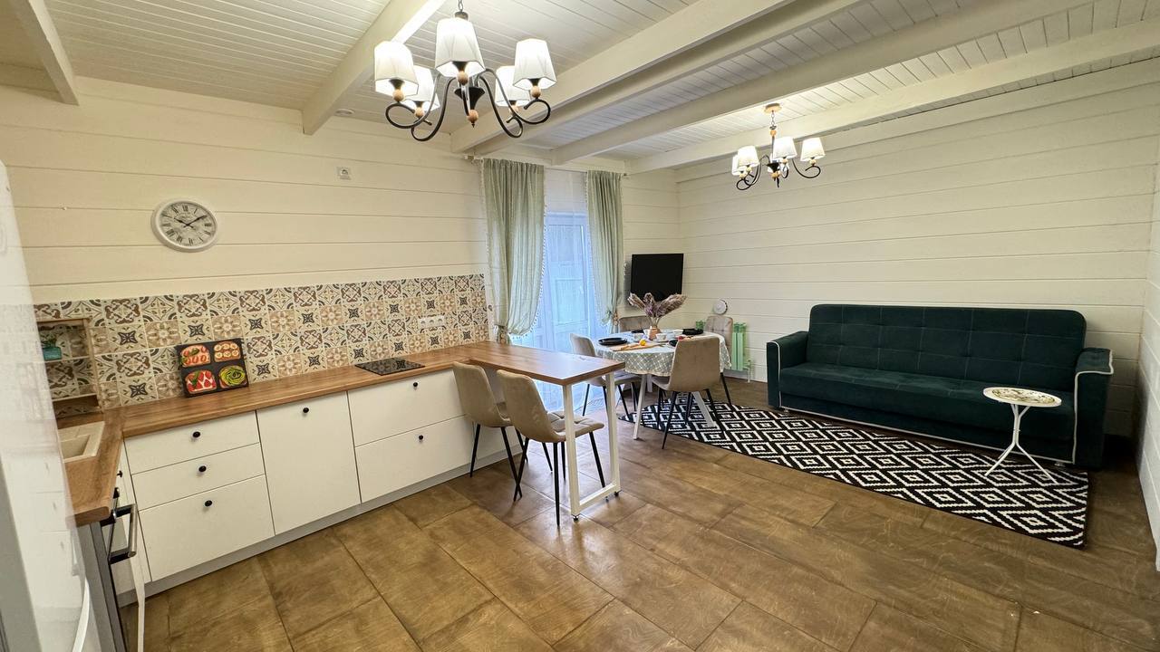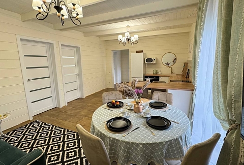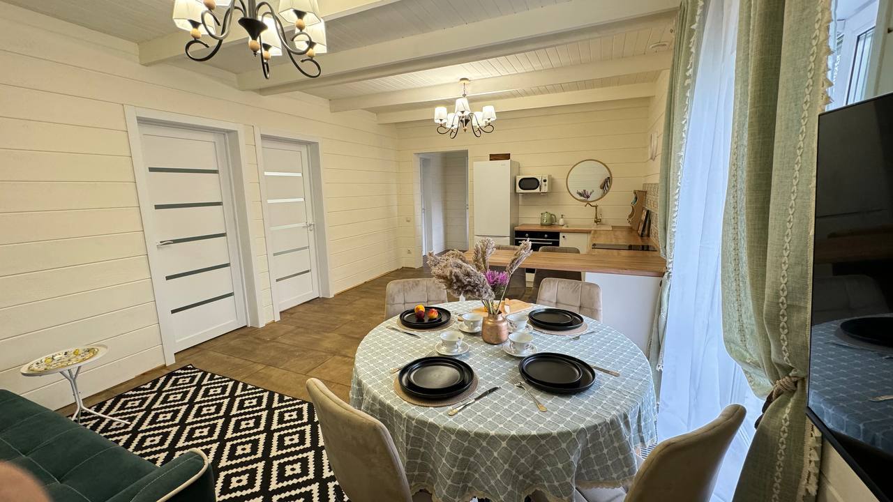 Одноэтажный коттедж с террасой разместился на благоустроенной закрытой территории площадью 10 соток. Четырехкомнатный дом полностью оснащен для комфортного отдыха и включает в себя три спальни и гостиную с кухней. В коттедже – уютные комнаты с современным ремонтом и теплым полом, гостиная с ЖК-телевизором и обеденной зоной, кухня с электроплитой, холодильником и посудой, совмещенный санузел с ванной и туалетными принадлежностями. В свободном доступе безлимитный интернет wi-fi. Коттедж оборудован террасой и мангальной зоной у дома. Принадлежности для барбекю, шампура и казан предоставляются. Также к услугам отдыхающих мини-парковка на территории, вмещающая до 5 автомобилей.