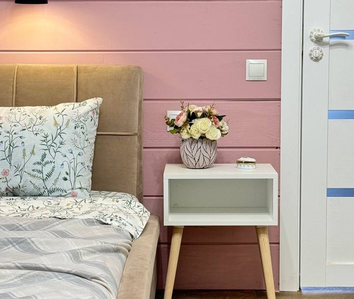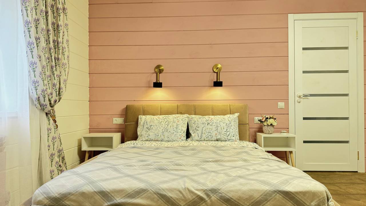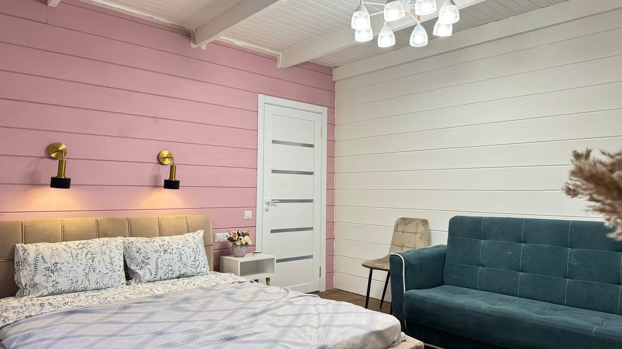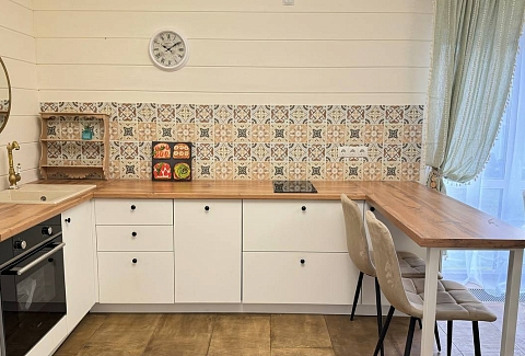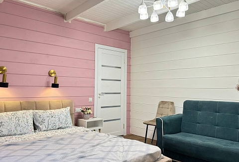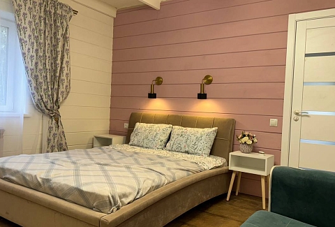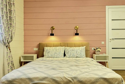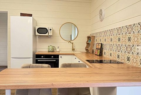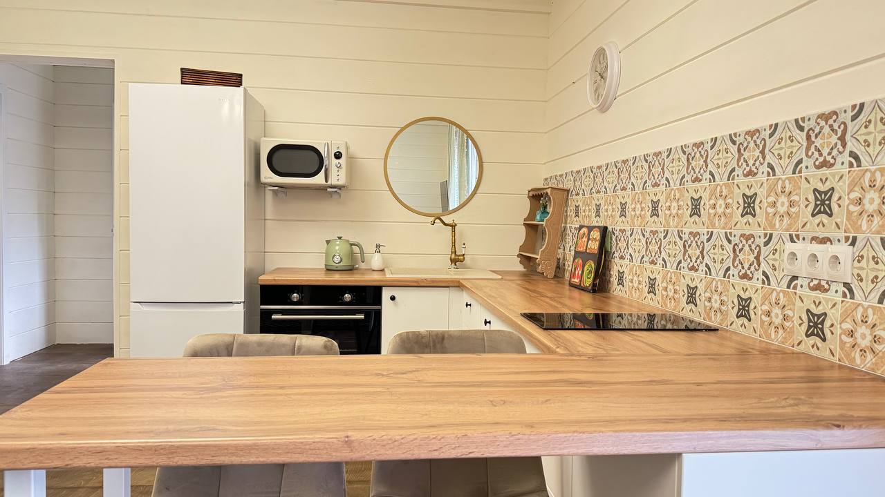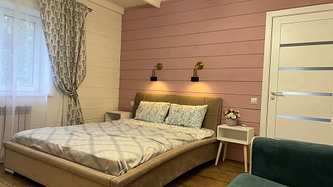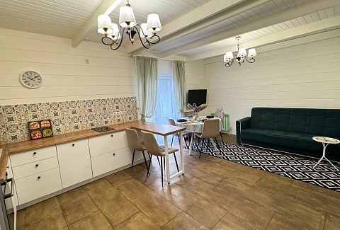 В номере: диван раскладной, кровать двуспальная, кухонная мебель, прикроватные тумбочки, стол, стулья, шкаф, духовой шкаф, микроволновая печь, набор посуды, плита электрическая, телевизор, теплый пол, холодильник, электрочайник
