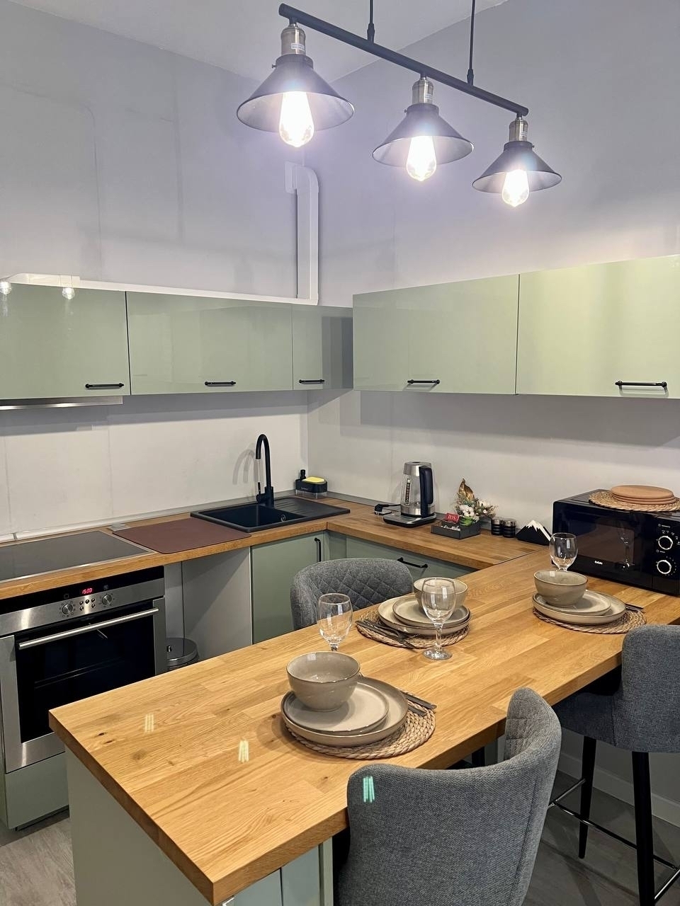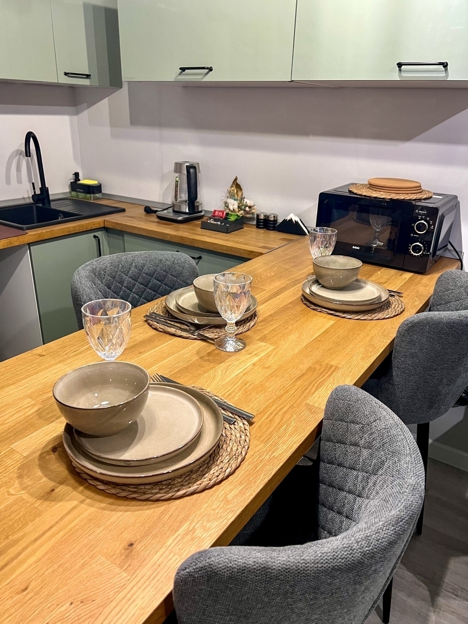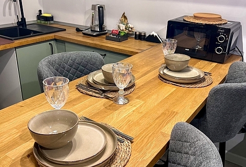 В номере: диван раскладной, комод, кухонная мебель, столик журнальный, стол обеденный, стулья, шкаф, духовой шкаф, кофемашина, микроволновая печь, набор посуды, плита электрическая, стиральная машина, телевизор, утюг, холодильник, электрочайник