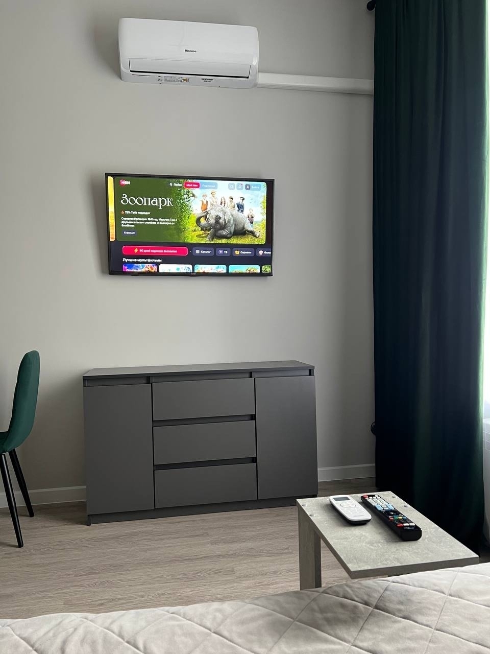 В номере: диван раскладной, комод, кухонная мебель, стол обеденный, стулья, шкаф, духовой шкаф, кондиционер, кофемашина, микроволновая печь, набор посуды, плита электрическая, стиральная машина, телевизор, утюг, холодильник, электрочайник