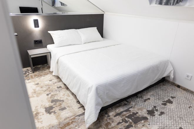 В номере: вешалка, зеркало, кровать двуспальная, прикроватные тумбочки, стол, стул, шкаф встроенный, кондиционер, мини-холодильник, телевизор, чайный набор посуды, электрочайник