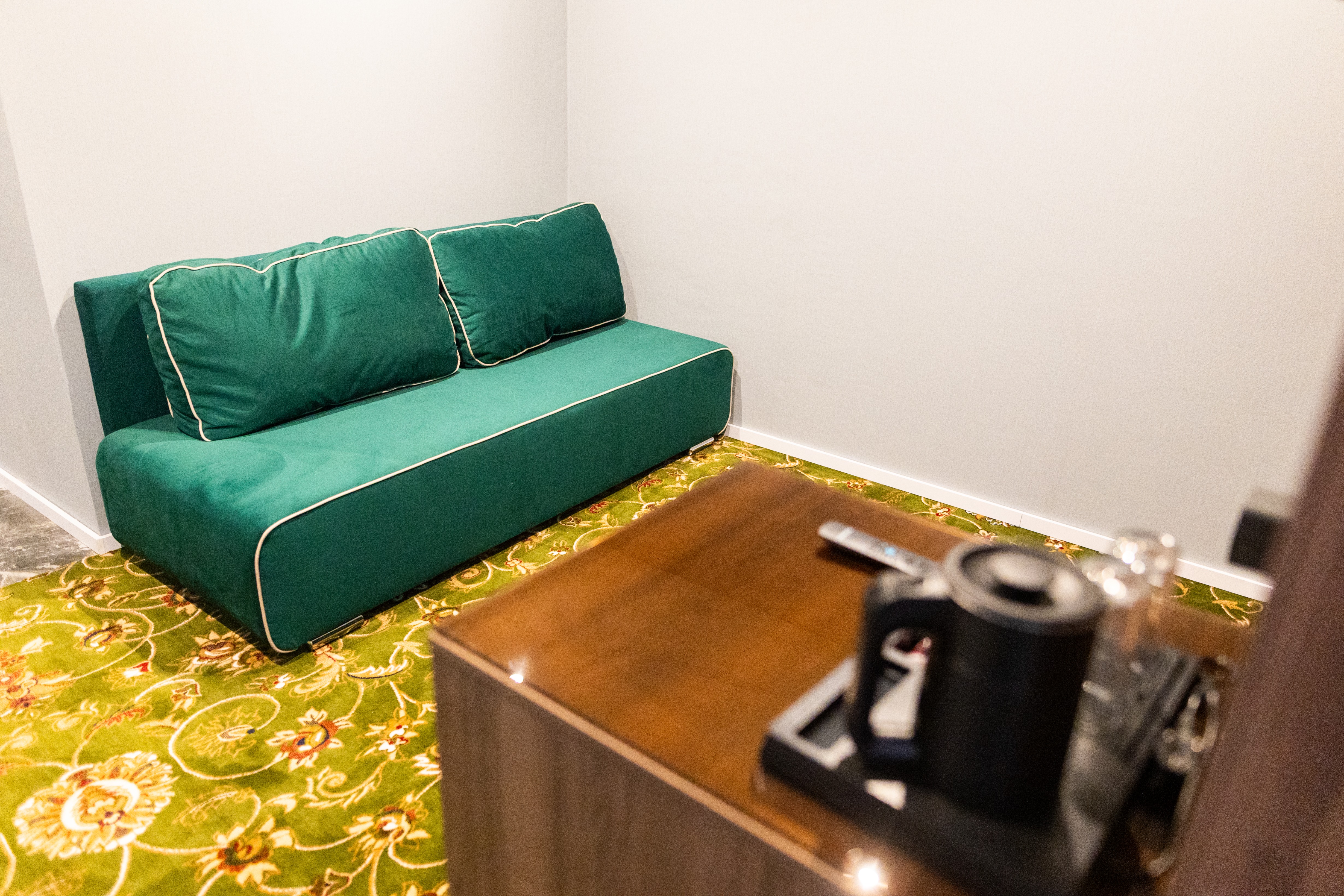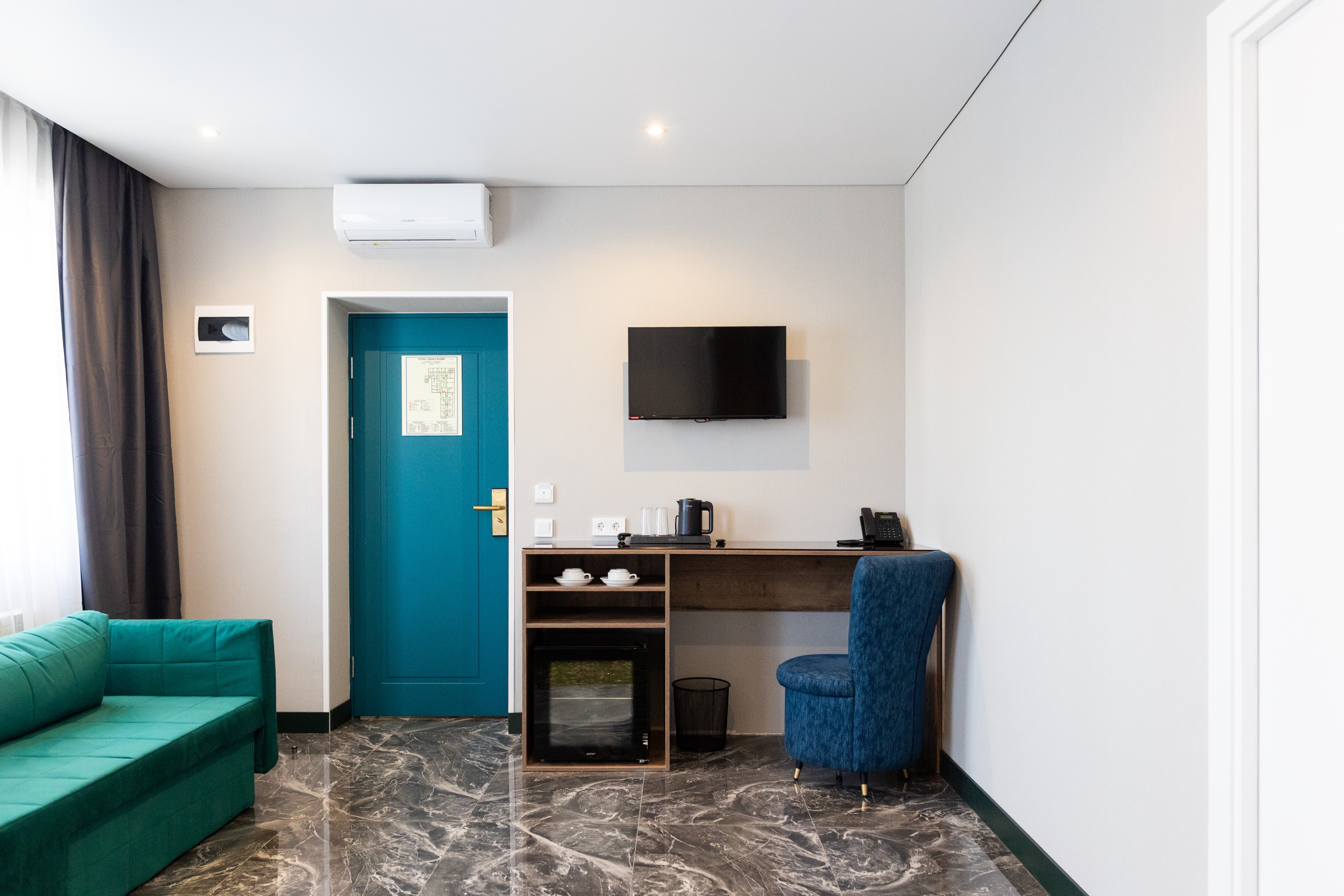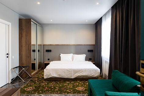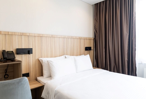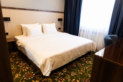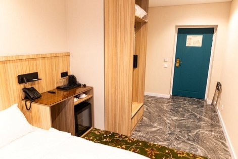 В номере: вешалка, зеркало, кровать двуспальная, прикроватные тумбочки, стол, шкаф, сейф, телевизор, телефон, холодильник, чайный набор посуды, электрочайник