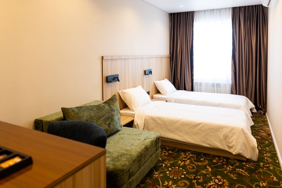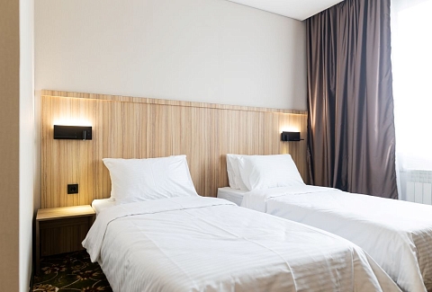 В номере: вешалка, зеркало, кровати полутороспальные, прикроватные тумбочки, стол, стул, шкаф, кондиционер, сейф, телевизор, чайный набор посуды, электрочайник