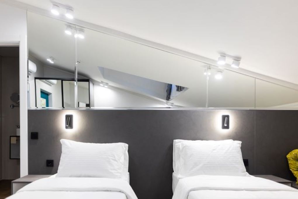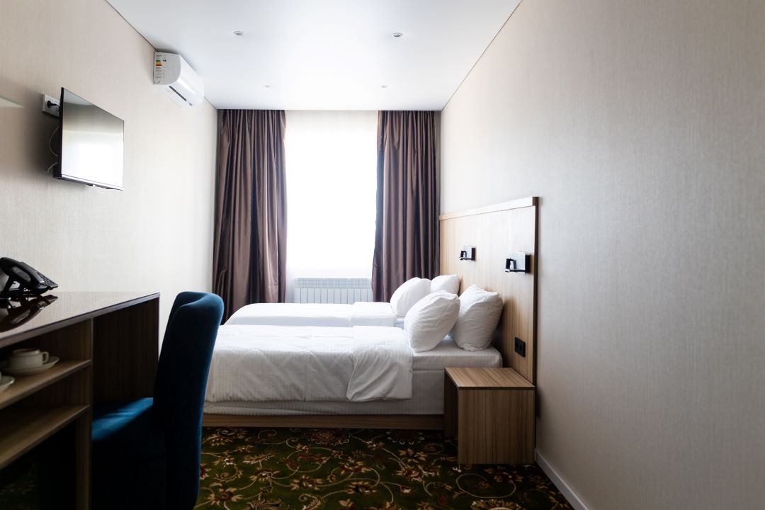 В номере: вешалка, зеркало, кровати односпальные, прикроватные тумбочки, стол, стулья, шкаф встроенный, кондиционер, сейф, телевизор, электрочайник