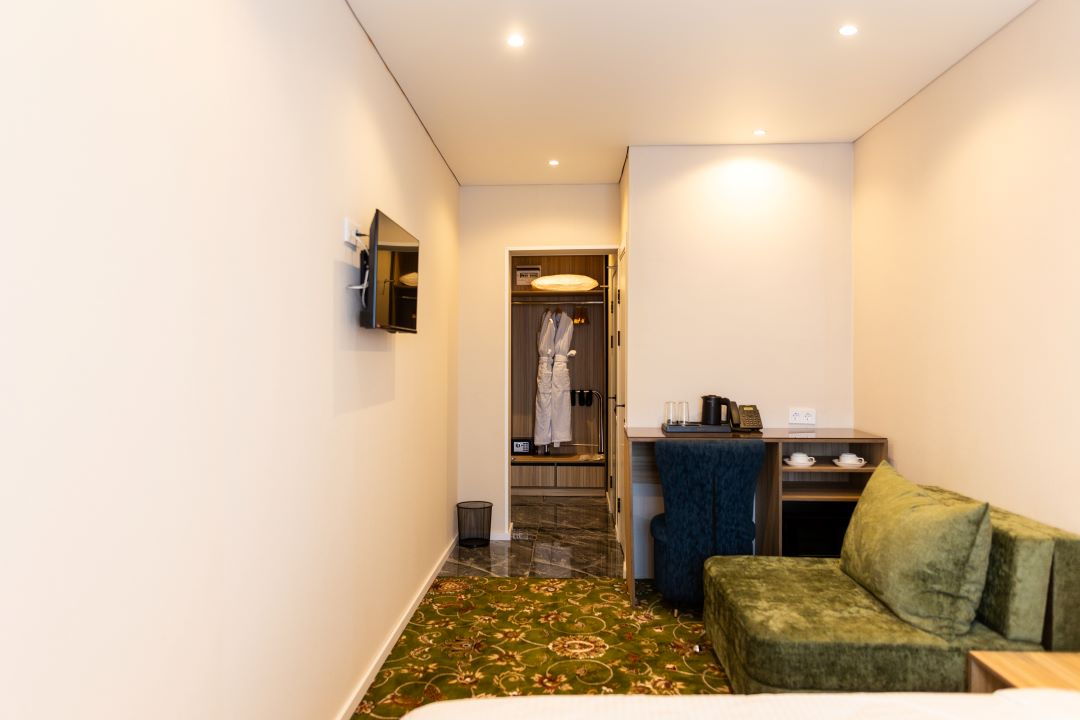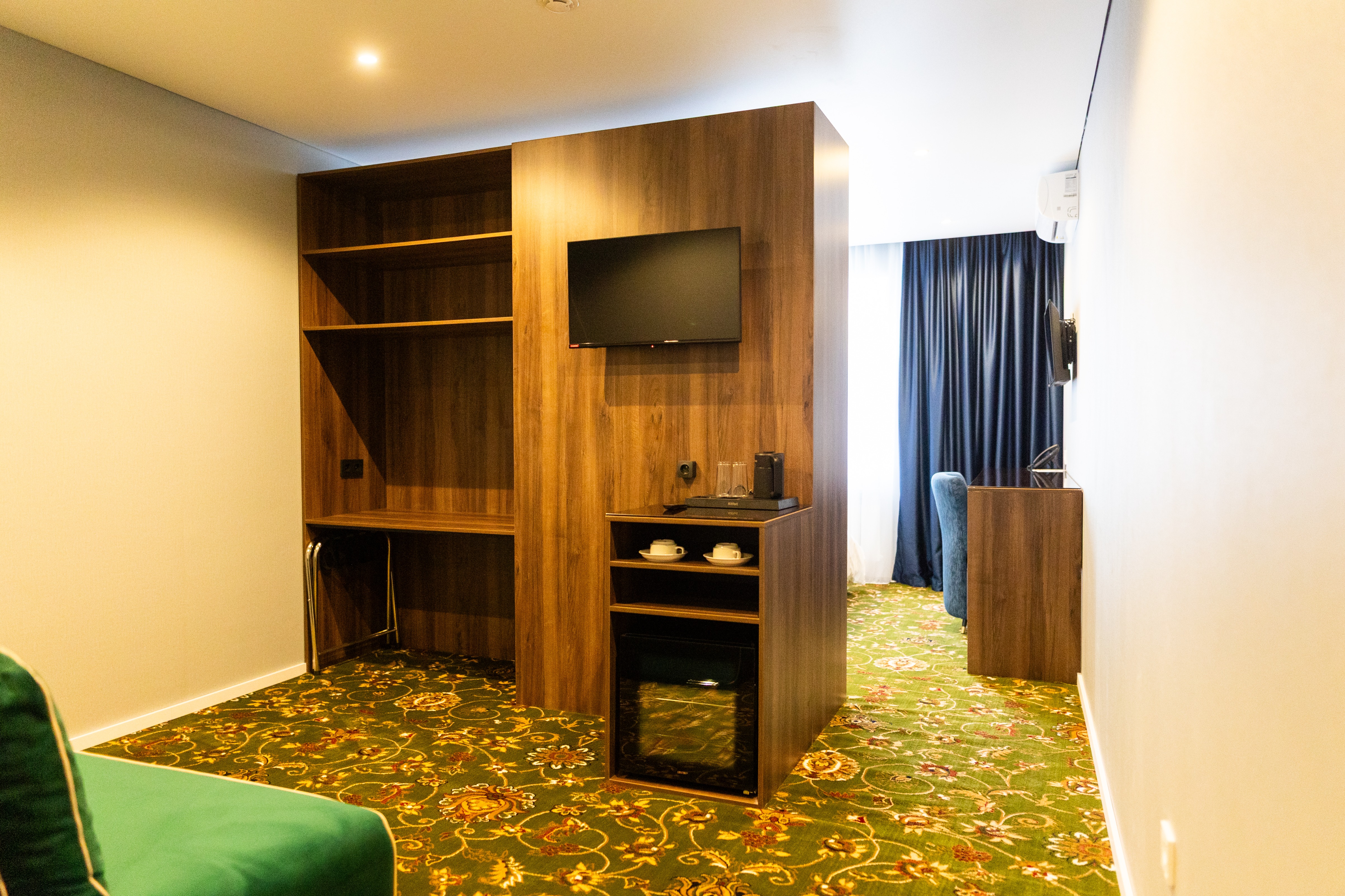 В номере: вешалка, зеркало, кровать двуспальная, прикроватные тумбочки, стол, стулья, шкаф встроенный, кондиционер, мини-холодильник, сейф, телевизор, чайная станция, чайный набор посуды