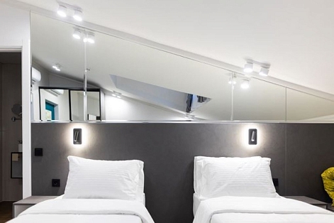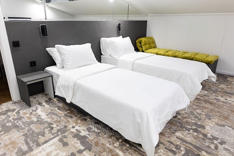 В номере: вешалка, зеркало, кресло, кровати полутороспальные, прикроватные тумбочки, стол, стул, шкаф встроенный, кондиционер, мини-холодильник, набор посуды, телевизор, чайная станция
