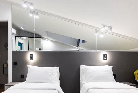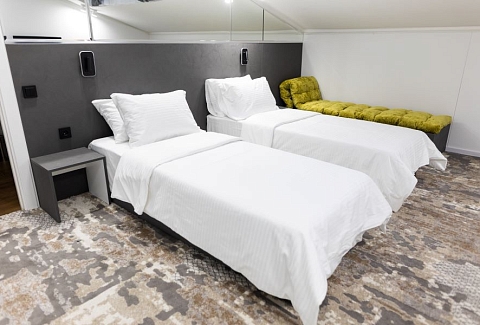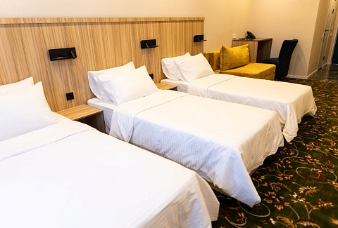 В номере: вешалка, зеркало, кресло-кровать, кровати односпальные, прикроватные тумбочки, стол, стулья, шкаф, кондиционер, сейф, телевизор, чайный набор посуды, электрочайник