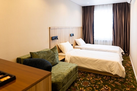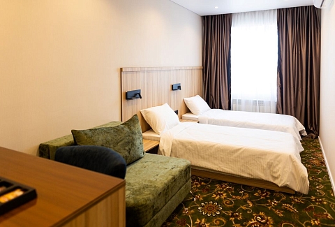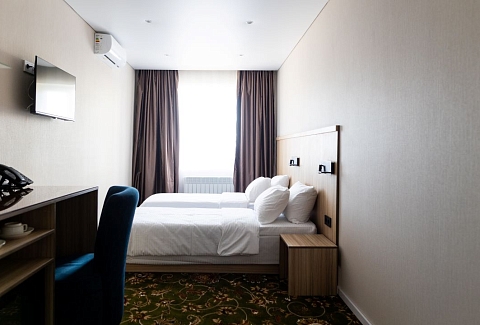 В номере: вешалка, зеркало, кровати полутороспальные, прикроватные тумбочки, стол, стулья, шкаф, кондиционер, сейф, телевизор, чайный набор посуды, электрочайник