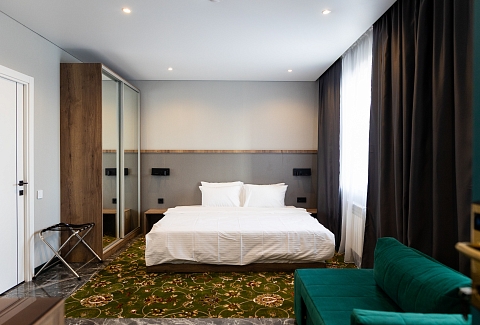В номере: вешалка, зеркало, кровать двуспальная, прикроватные тумбочки, стол, стул, шкаф, кондиционер, сейф, телевизор, чайный набор посуды, электрочайник