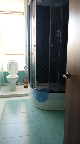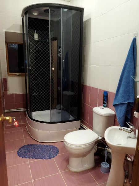 Санузел: с душевой кабиной, тапочки, туалетные принадлежности, фен