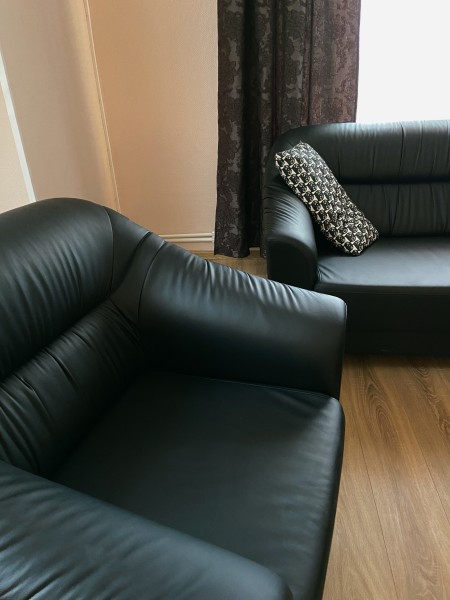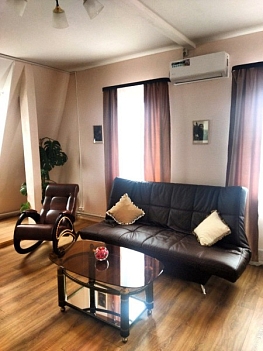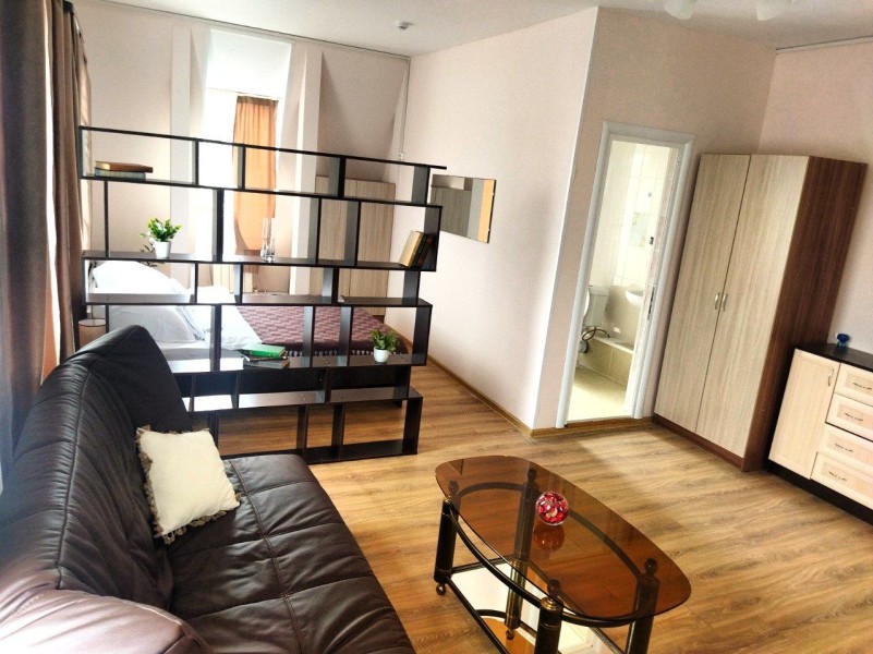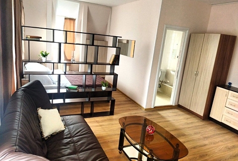 В номере: вешалка, диван, зеркало, кровать двуспальная, прикроватные тумбочки, стол, стулья, шкаф, кондиционер, телевизор, холодильник, чайный набор посуды, электрочайник