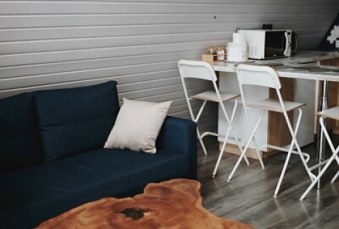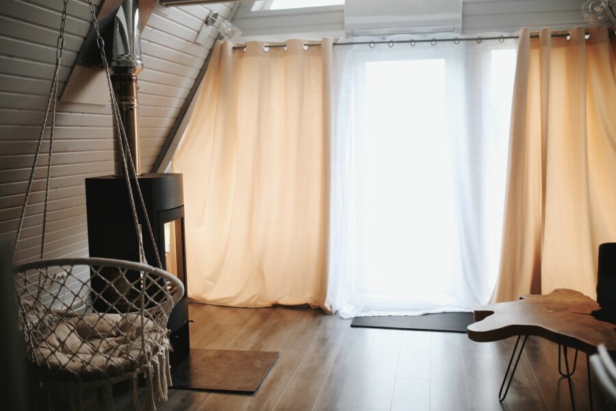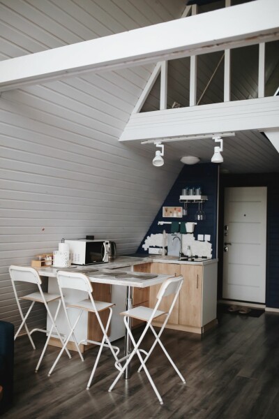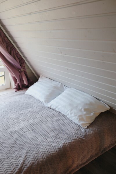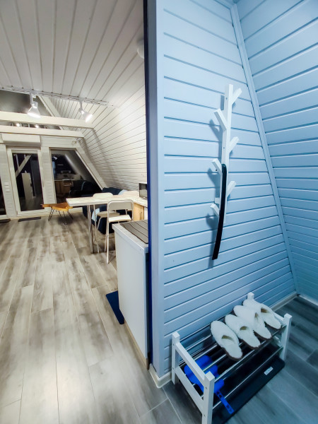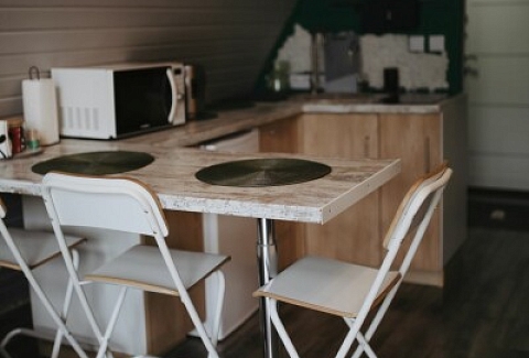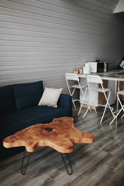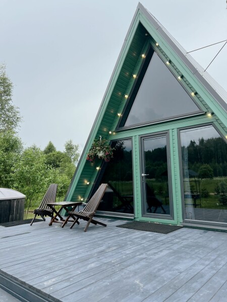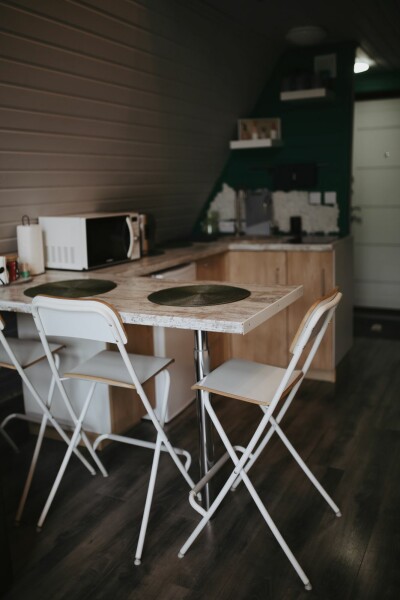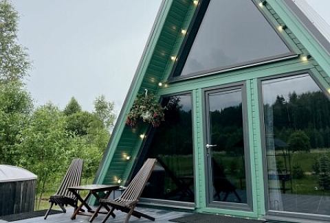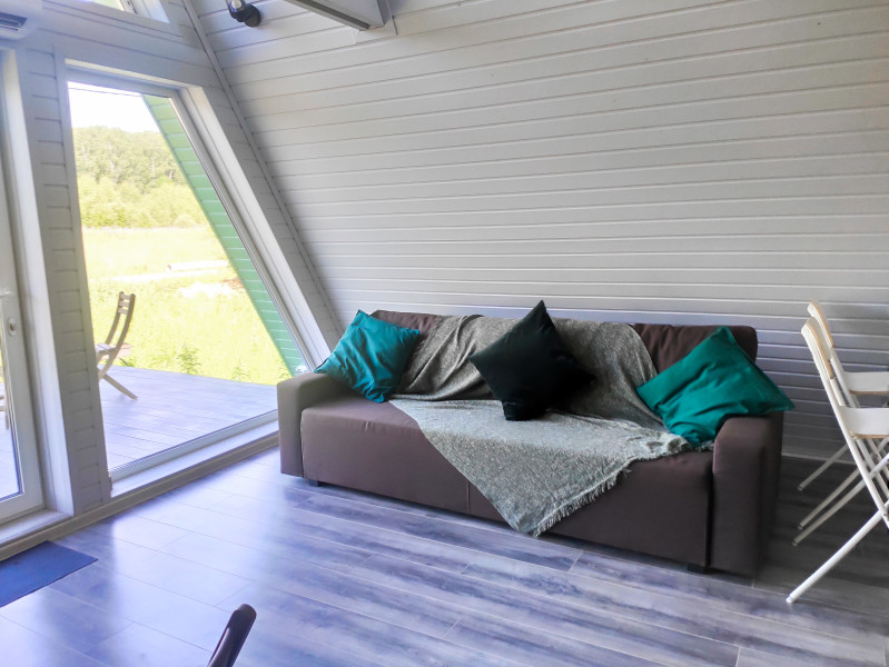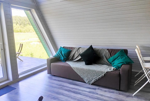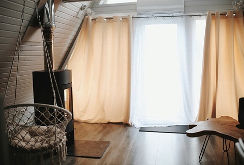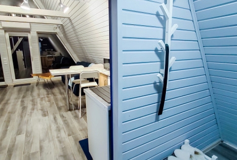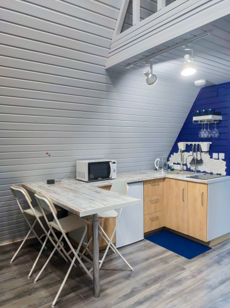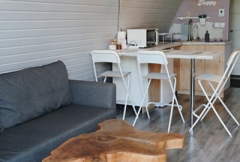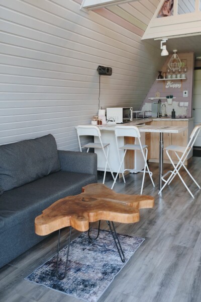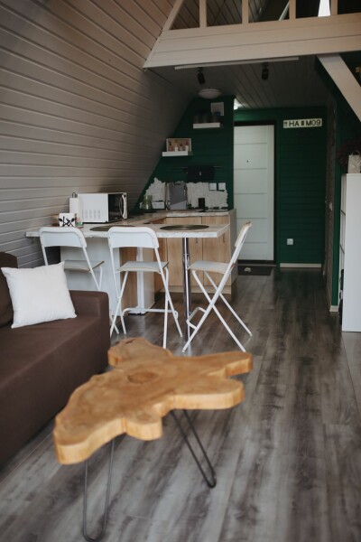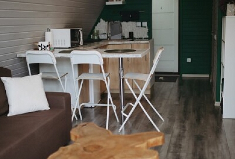 Каждый домик подходит для круглогодичного проживания. Камин создаст уют и тепло, теплый пол поможет его поддержать, плюс есть пледы и тапочки.В ванной комнате найдете туалет, душевую кабину, раковину, полотенца, мыло, шампунь.На кухне: микроволновка, плита, чайник, станция Алиса, раковина и кран с питьевой водой, посуда необходимая для готовки, тарелки, чашки, бокалы, чай, кофе, гейзерная кофеварка, барная стойка и барные стулья.В каждом домике 4 спальных места, матрас на 2 этаже и раскладной диван на первом. Дополнительное место возможно, но это раскладушка, поэтому комфортный отдых на ней мы обещать не сможем.В гостиной располагается камин, диван, журнальный столик, два стула, кресло-качели.