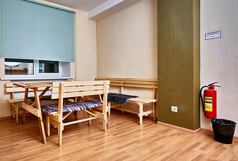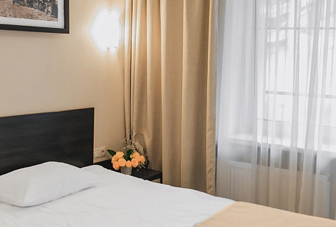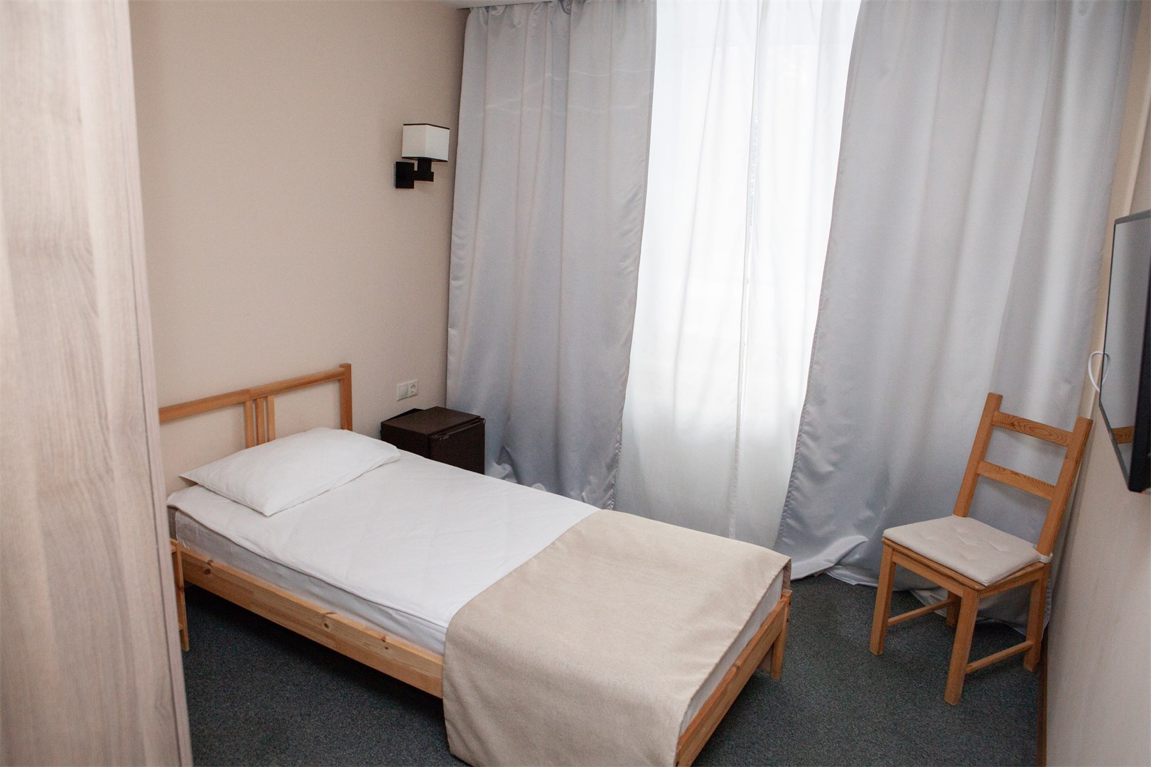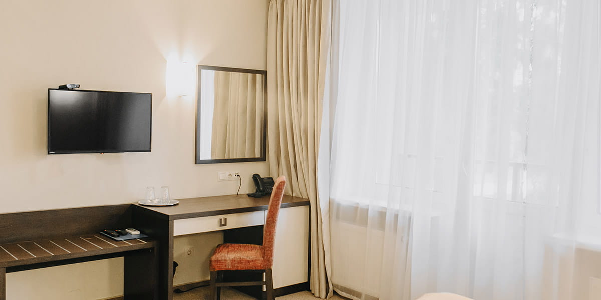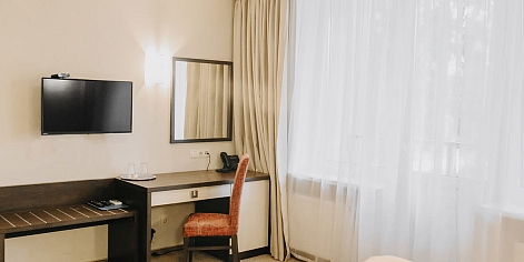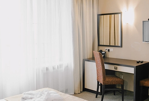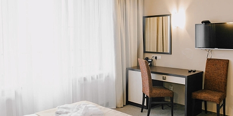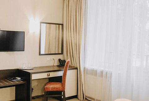 В номере: вешалка, зеркало, кровать односпальная, прикроватная тумбочка, стол, стул, шкаф, мини-холодильник, набор посуды, сейф, телевизор, телефон, электрочайник