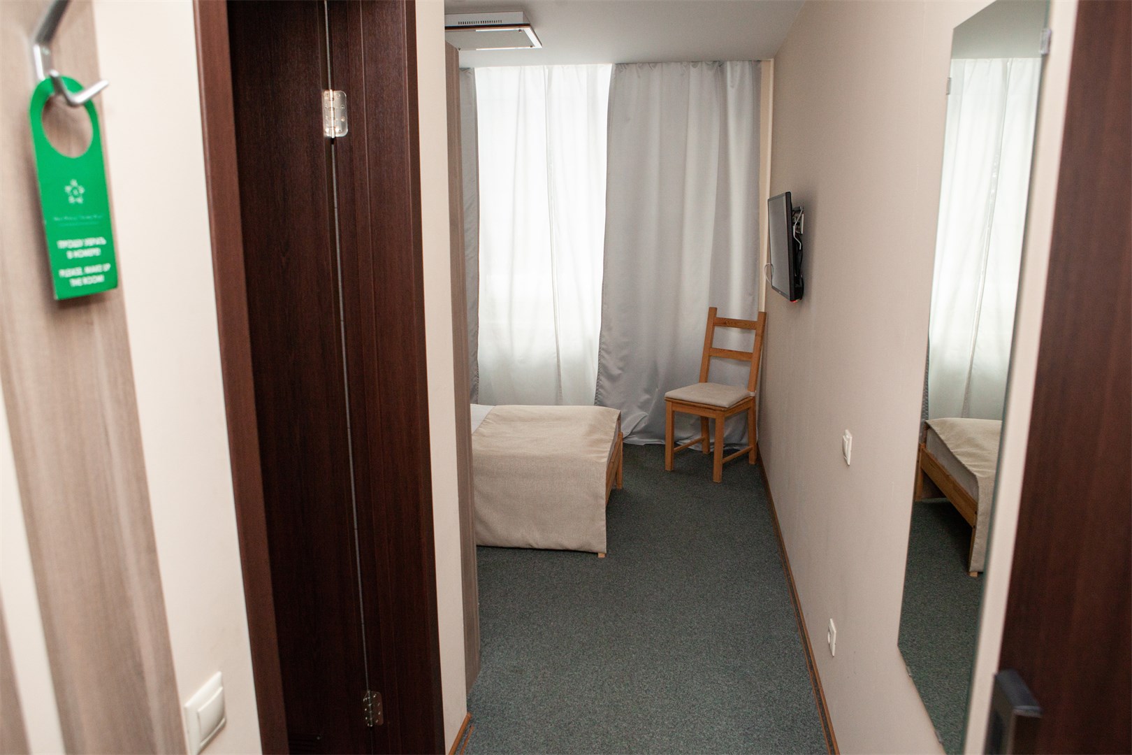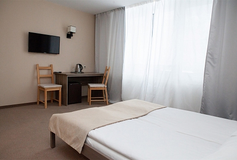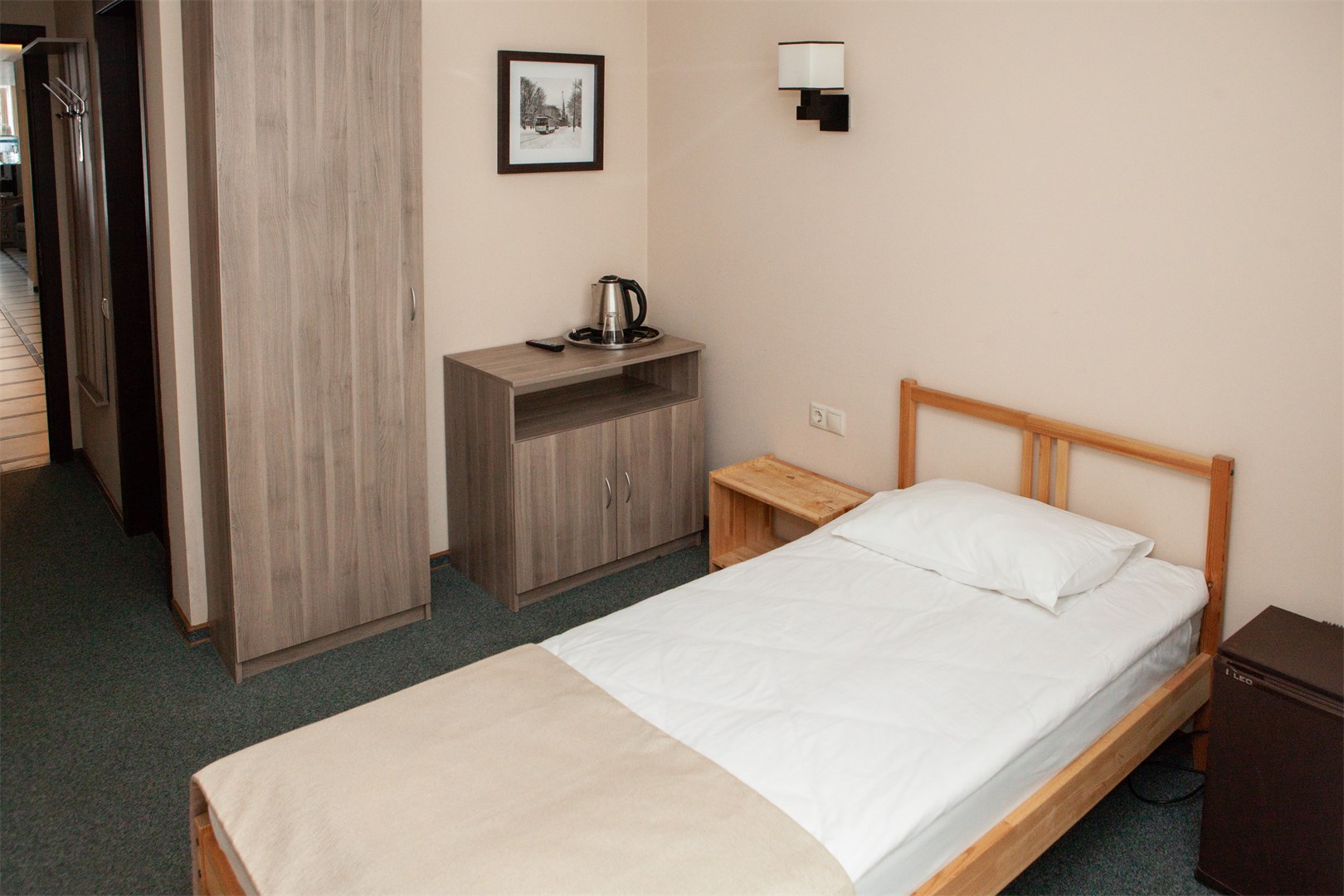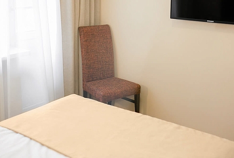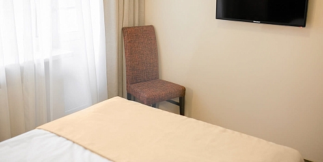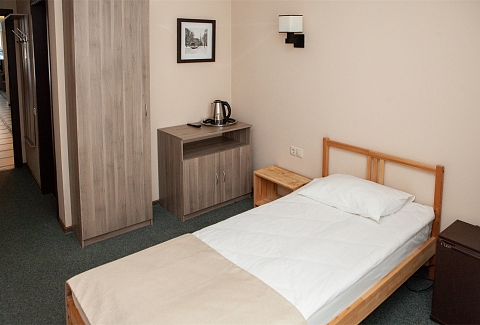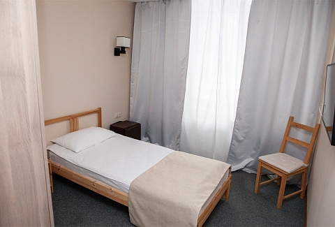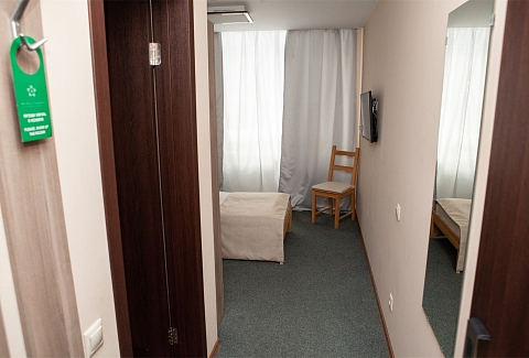 В номере: вешалка, зеркало, кровать односпальная, прикроватная тумбочка, стул, тумба, шкаф, мини-холодильник, телевизор ЖК, телефон, электрочайник