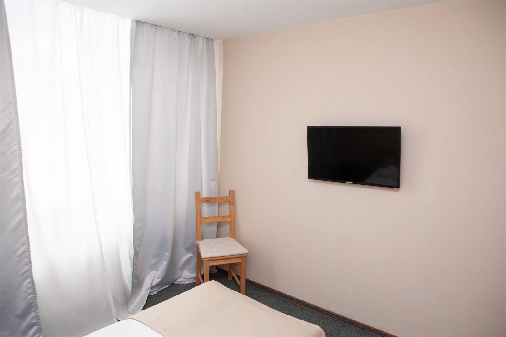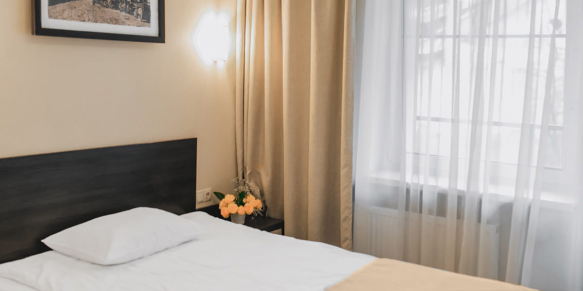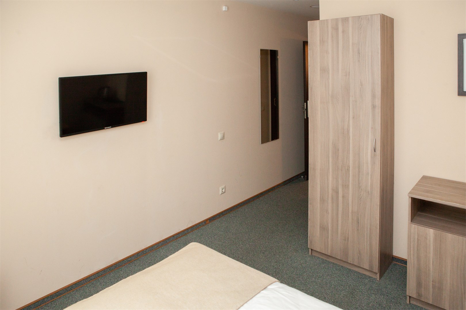 В номере: вешалка, зеркало, кровать односпальная, прикроватная тумбочка, стул, тумба, шкаф, мини-холодильник, телевизор ЖК, телефон, электрочайник