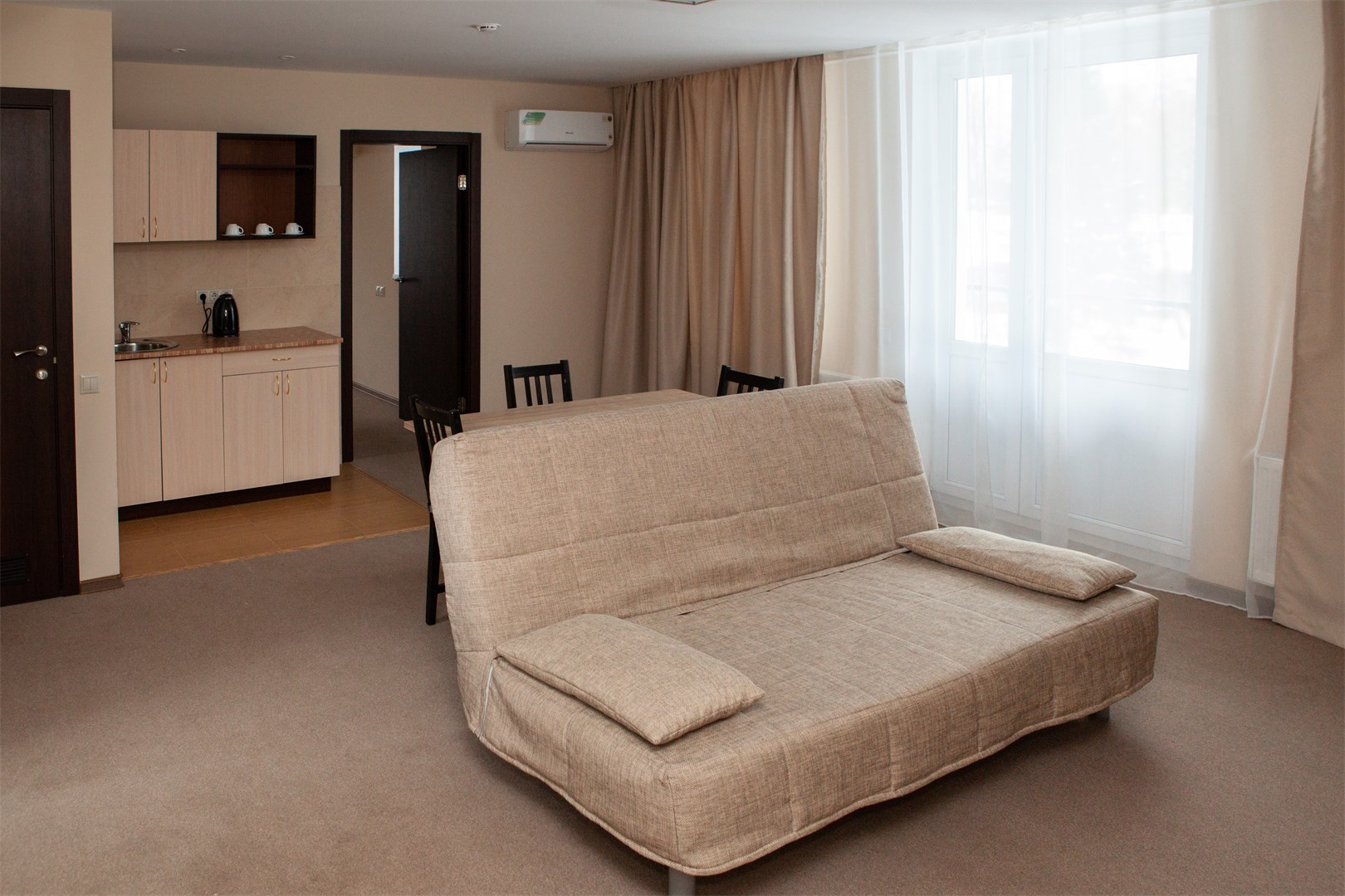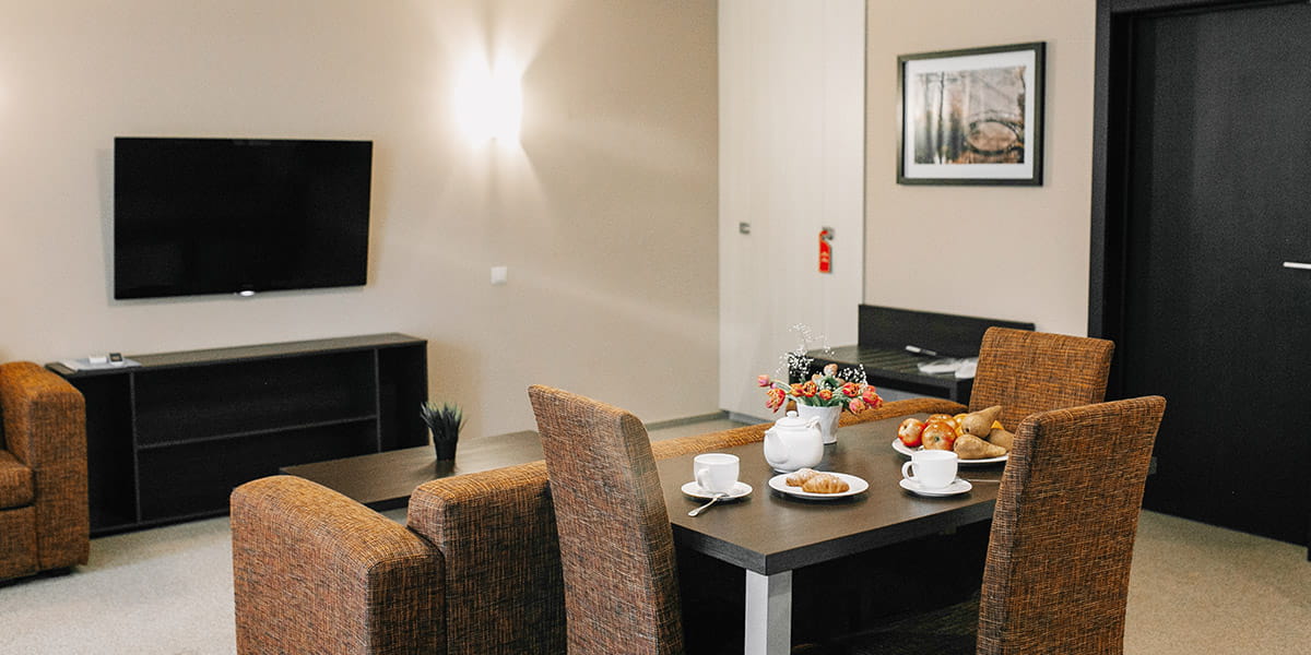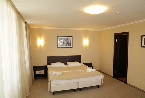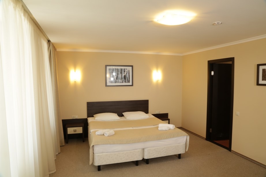 В номере: вешалка, диван, зеркало, кровать двуспальная, прикроватные тумбочки, стол, стулья, шкаф, кондиционер, микроволновая печь, мини-холодильник, набор посуды, сейф, телевизор, телефон, электрочайник