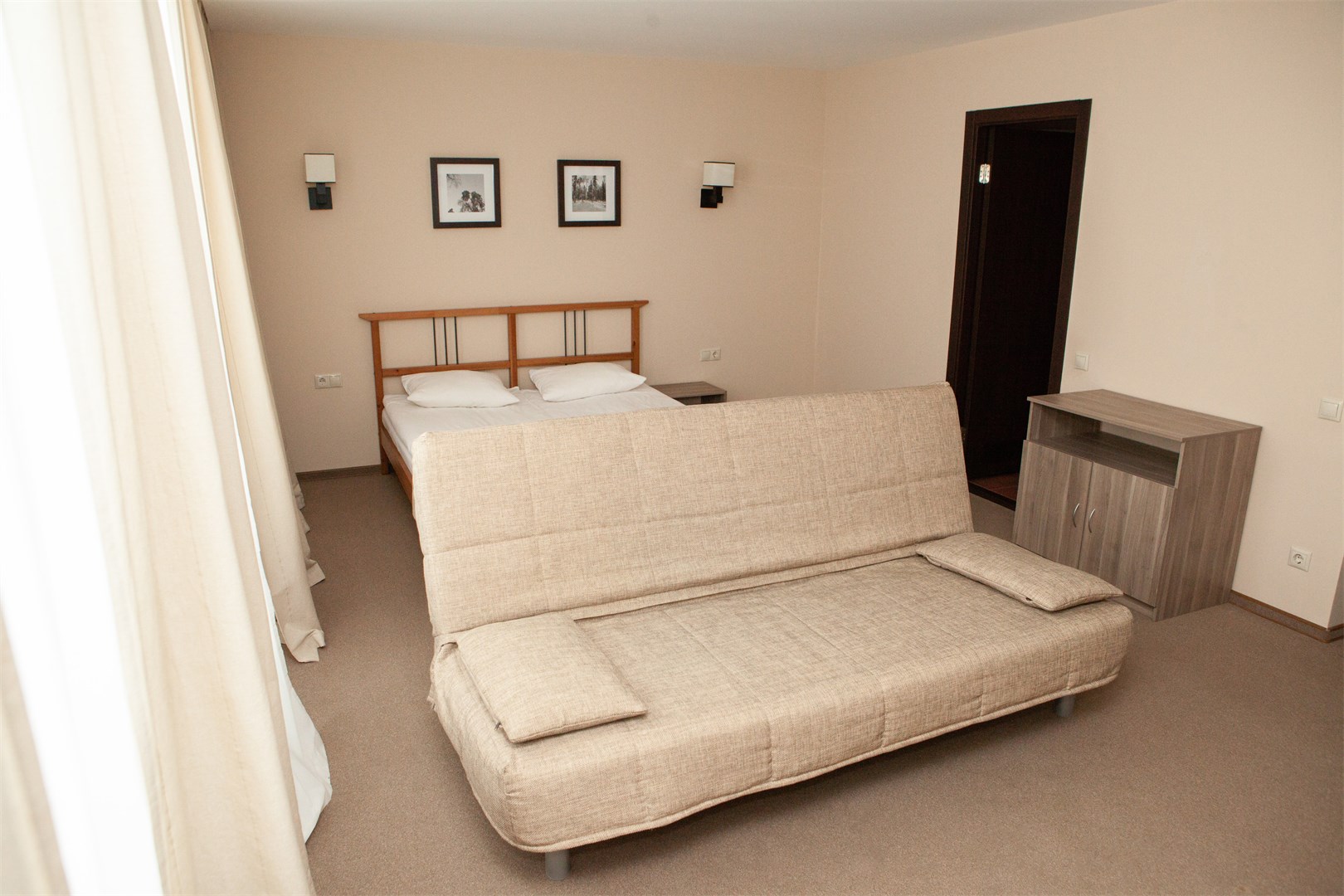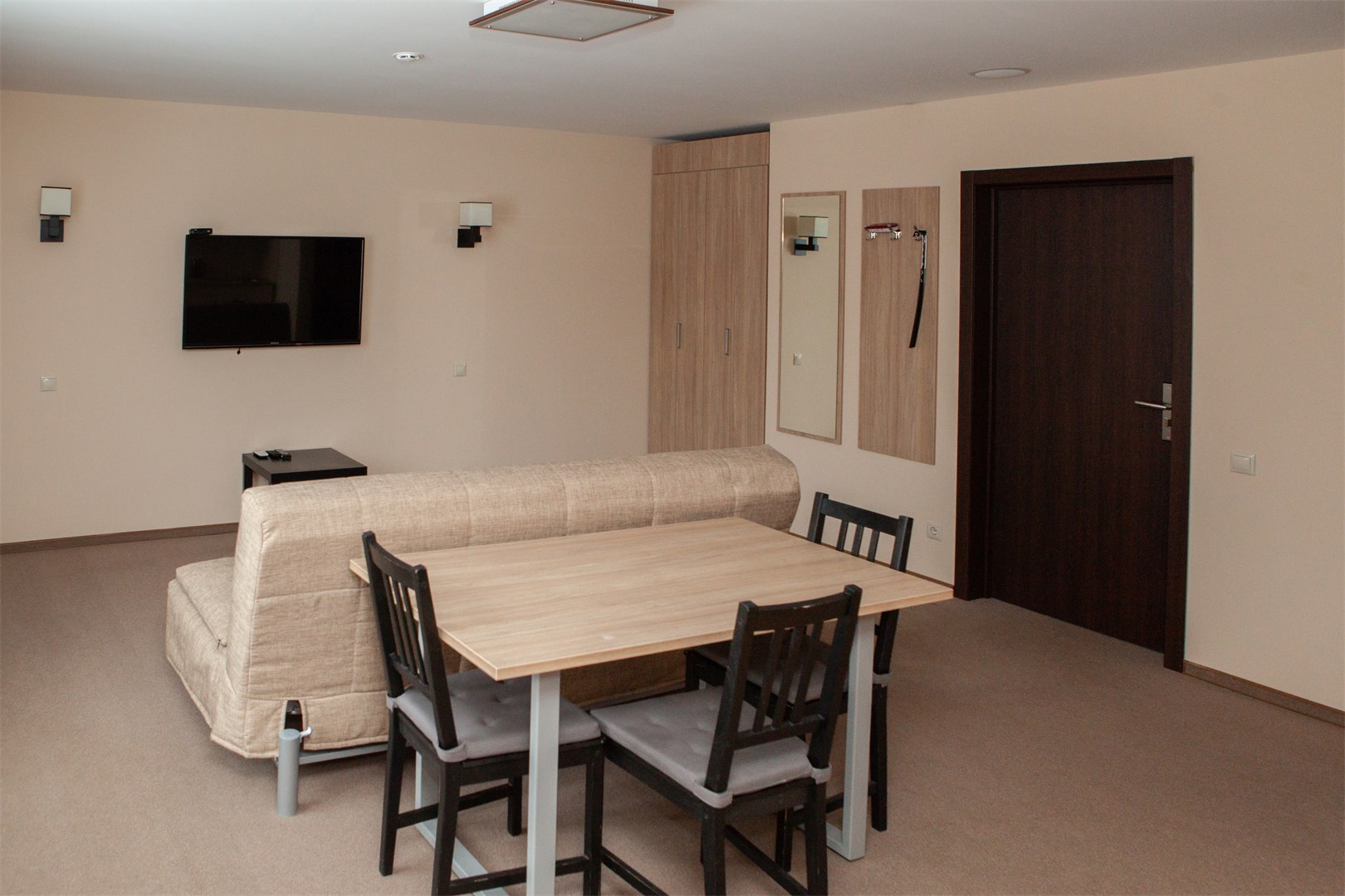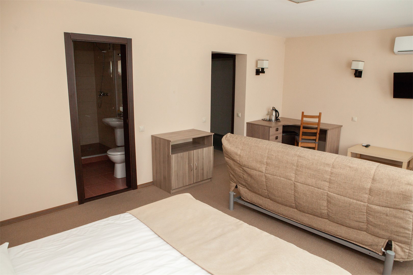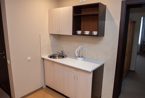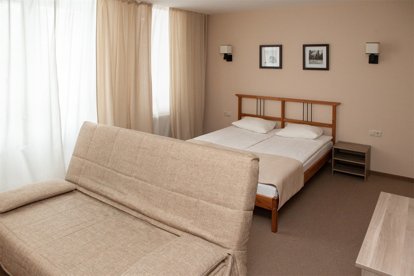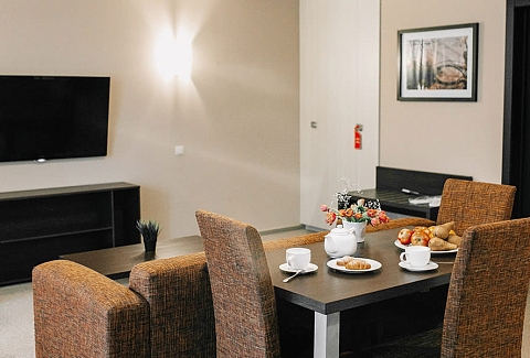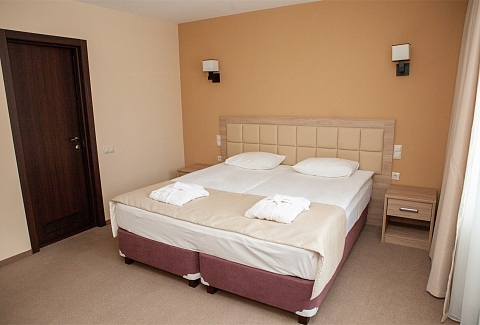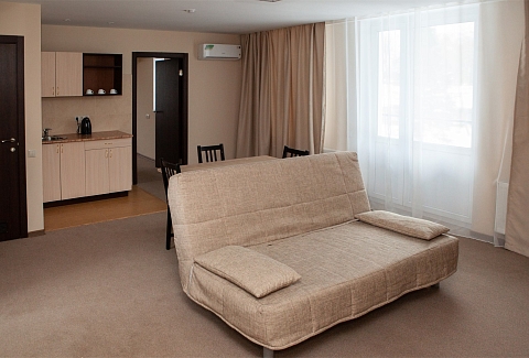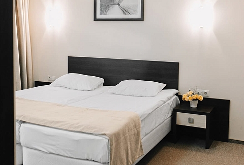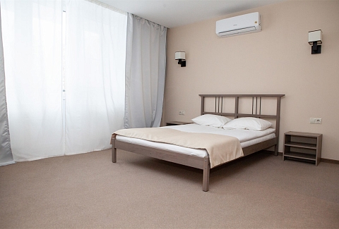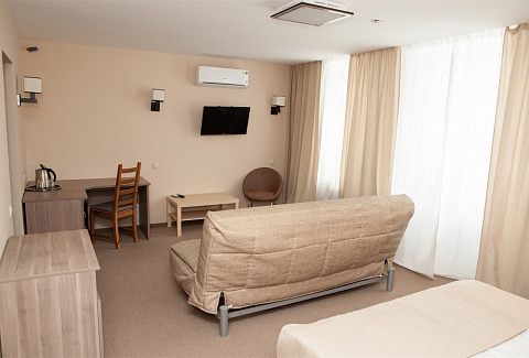 В номере: вешалка, диван раскладной, зеркало, кровати односпальные /одна двуспальная кровать, прикроватные тумбочки, стол, стулья, шкаф, кондиционер, мини-холодильник, набор посуды, телевизор ЖК, телефон, электрочайник