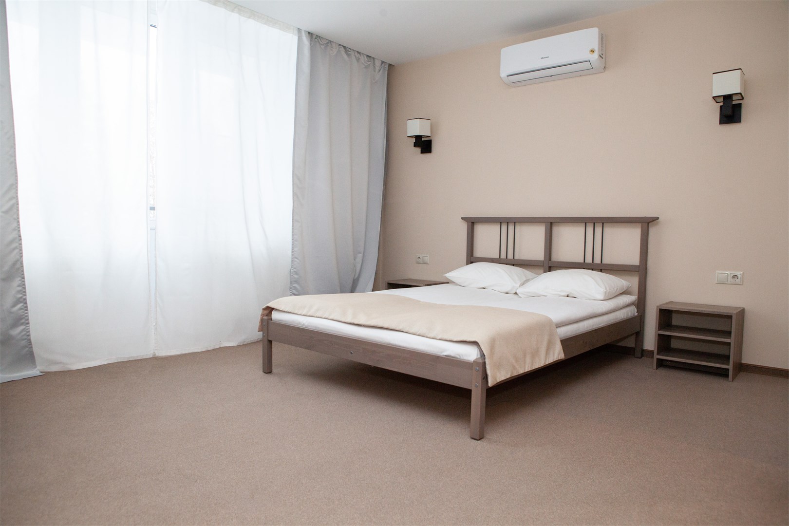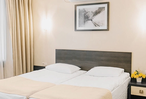 В номере: вешалка, зеркало, кровати односпальные, прикроватные тумбочки, стол, стулья, шкаф, кондиционер, мини-холодильник, телевизор ЖК, телефон, электрочайник