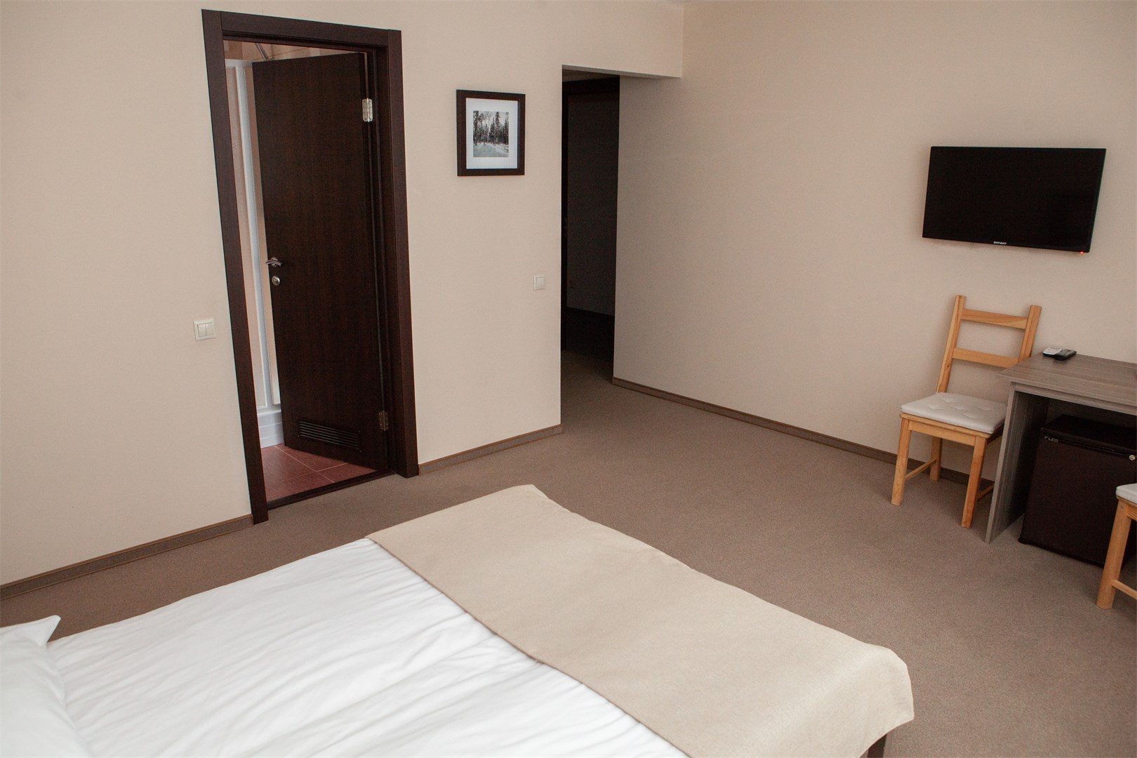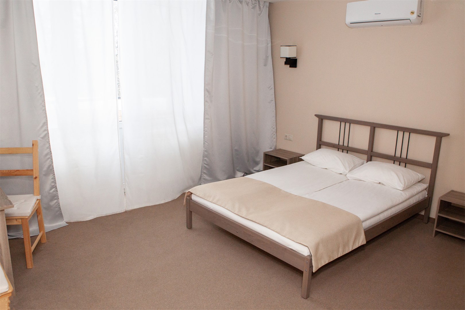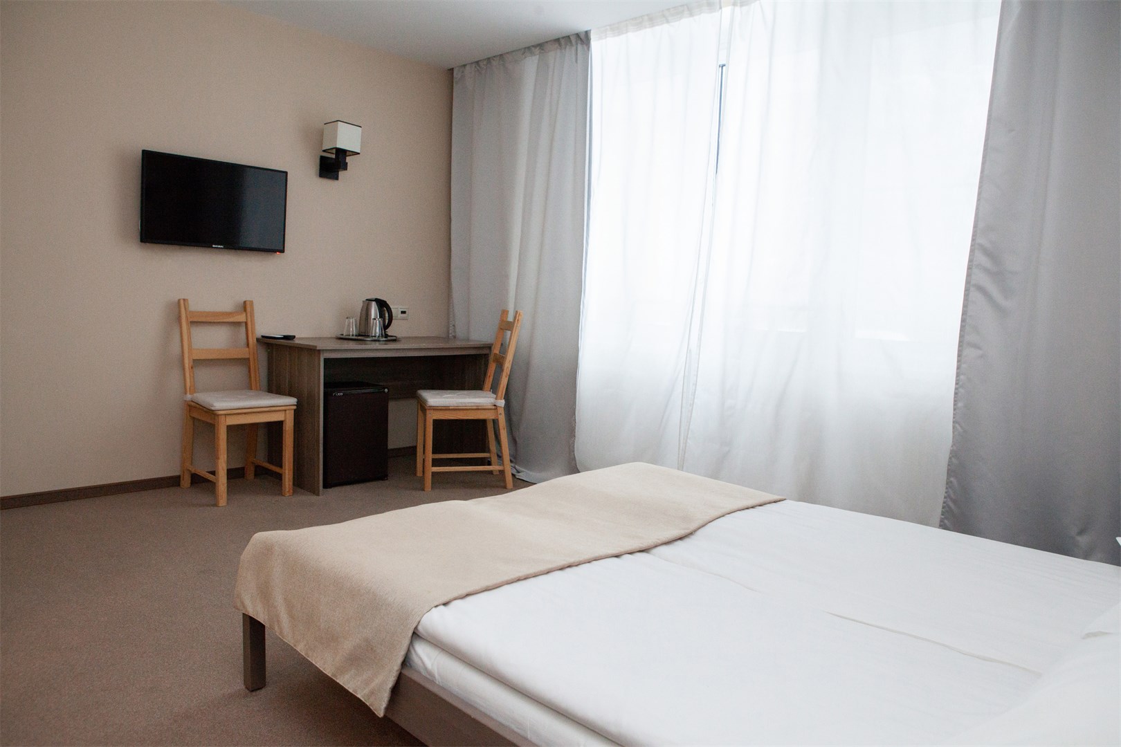 В номере: вешалка, кровать двуспальная, прикроватные тумбочки, стол, стулья, тумба, мини-холодильник, чайный набор посуды, электрочайник