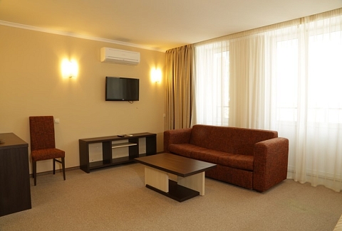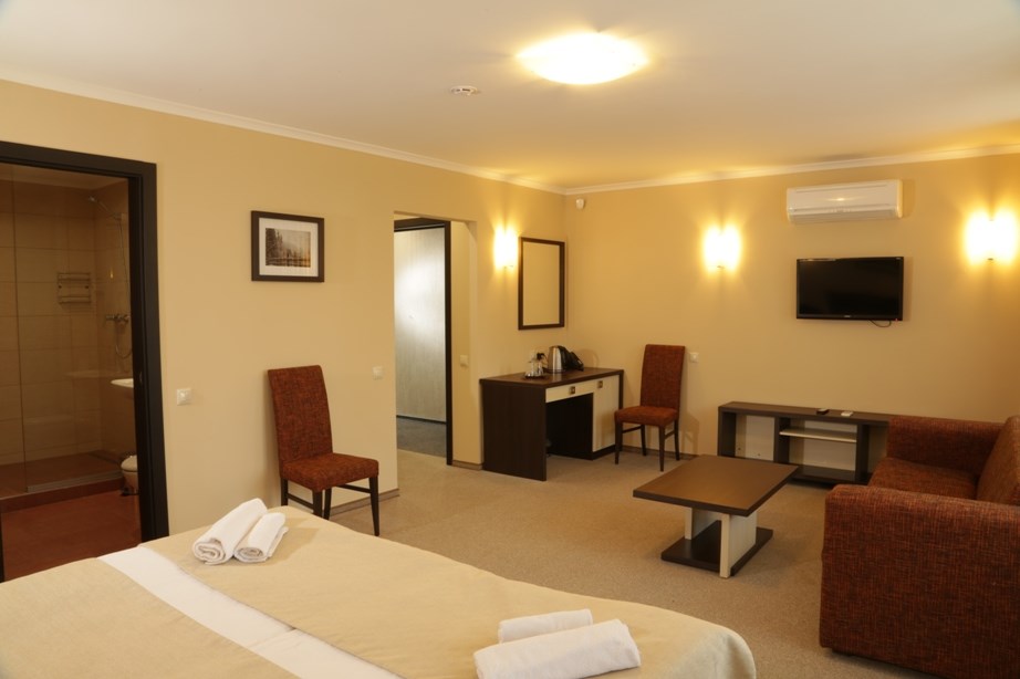 В номере: вешалка, диван раскладной, зеркало, кровати односпальные /одна двуспальная кровать, прикроватные тумбочки, стол, столик журнальный, стулья, тумба багажная, шкаф, кондиционер, мини-холодильник, телевизор ЖК, телефон, электрочайник