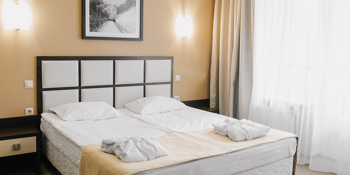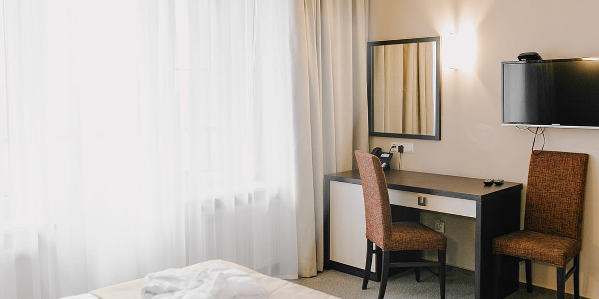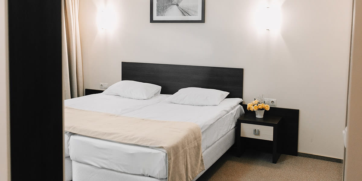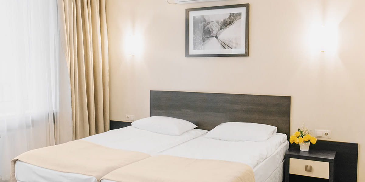 В номере: вешалка, зеркало, кровати односпальные, прикроватные тумбочки, стол, стулья, шкаф, кондиционер, мини-холодильник, набор посуды, сейф, телевизор, телефон, электрочайник