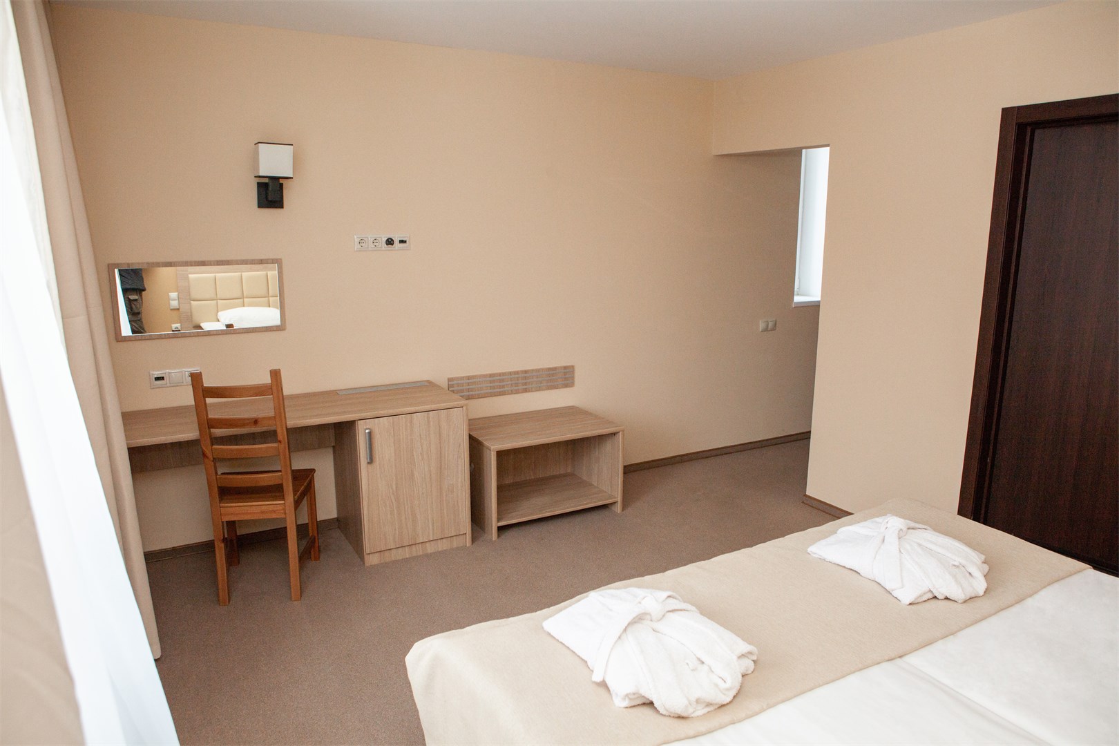 В номере: вешалка, зеркало, кровати односпальные /одна двуспальная кровать, прикроватные тумбочки, стол, стулья, шкаф, кондиционер, мини-холодильник, набор посуды, сейф, телевизор, телефон, электрочайник
