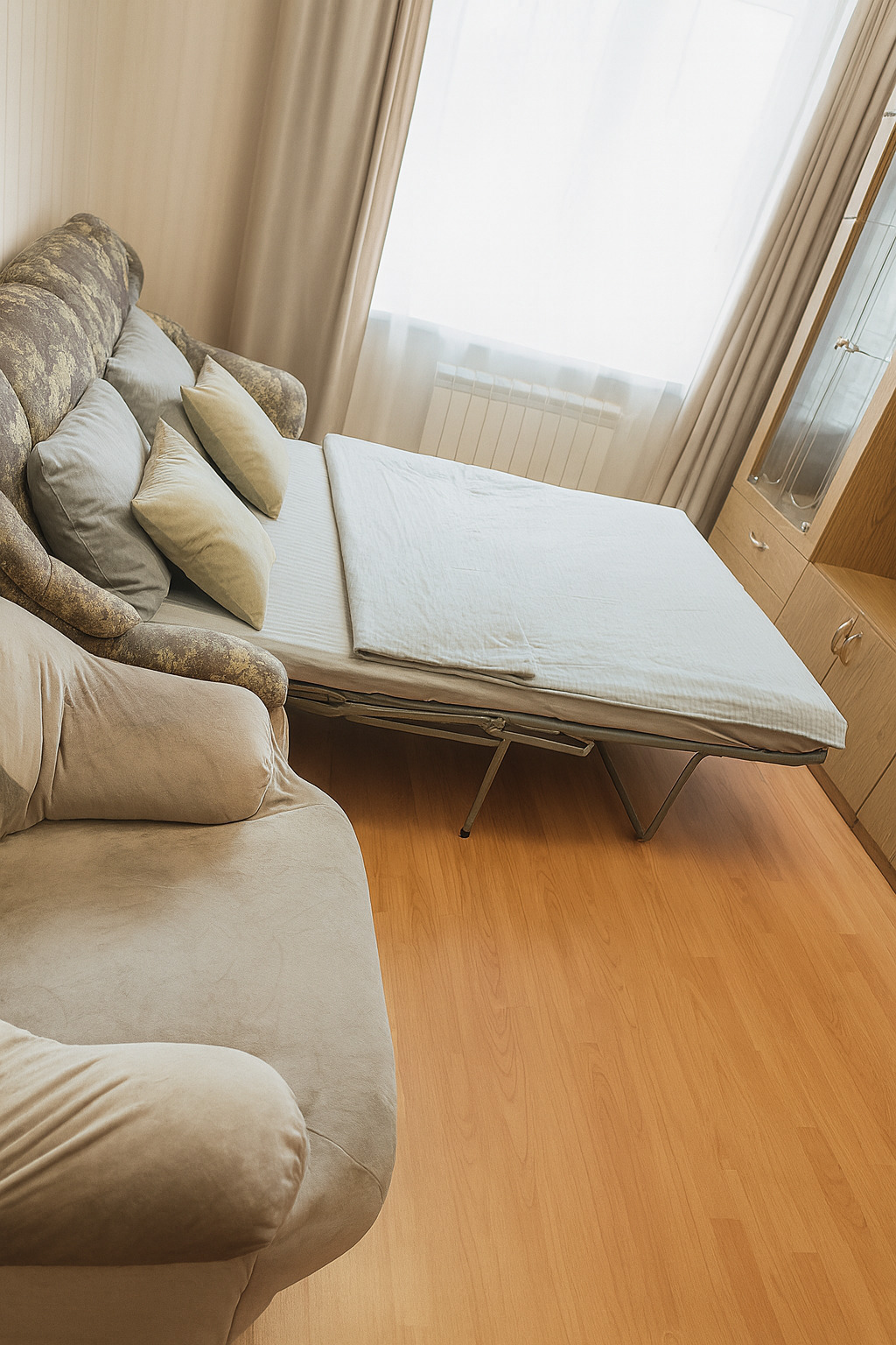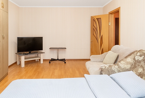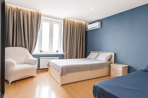 Три раздельных спальных места представлены двуспальной кроватью и двумя удобными диванами. В помещении установлен кондиционер, а большая застеклённая лоджия добавляет света и простора. Кухня полностью оснащена необходимой техникой и посудой — холодильник, плита, микроволновая печь, чайник. В раздельном санузле — полноценная ванна, стиральная машина, фен и средства гигиены. В апартаментах есть телевизор со Smart TV и бесплатный Wi‑Fi.Это пространство создано для тех, кто ценит удобство, порядок и продуманные детали. Здесь одинаково комфортно размещаться во время командировки, короткой поездки или семейного уикенда.