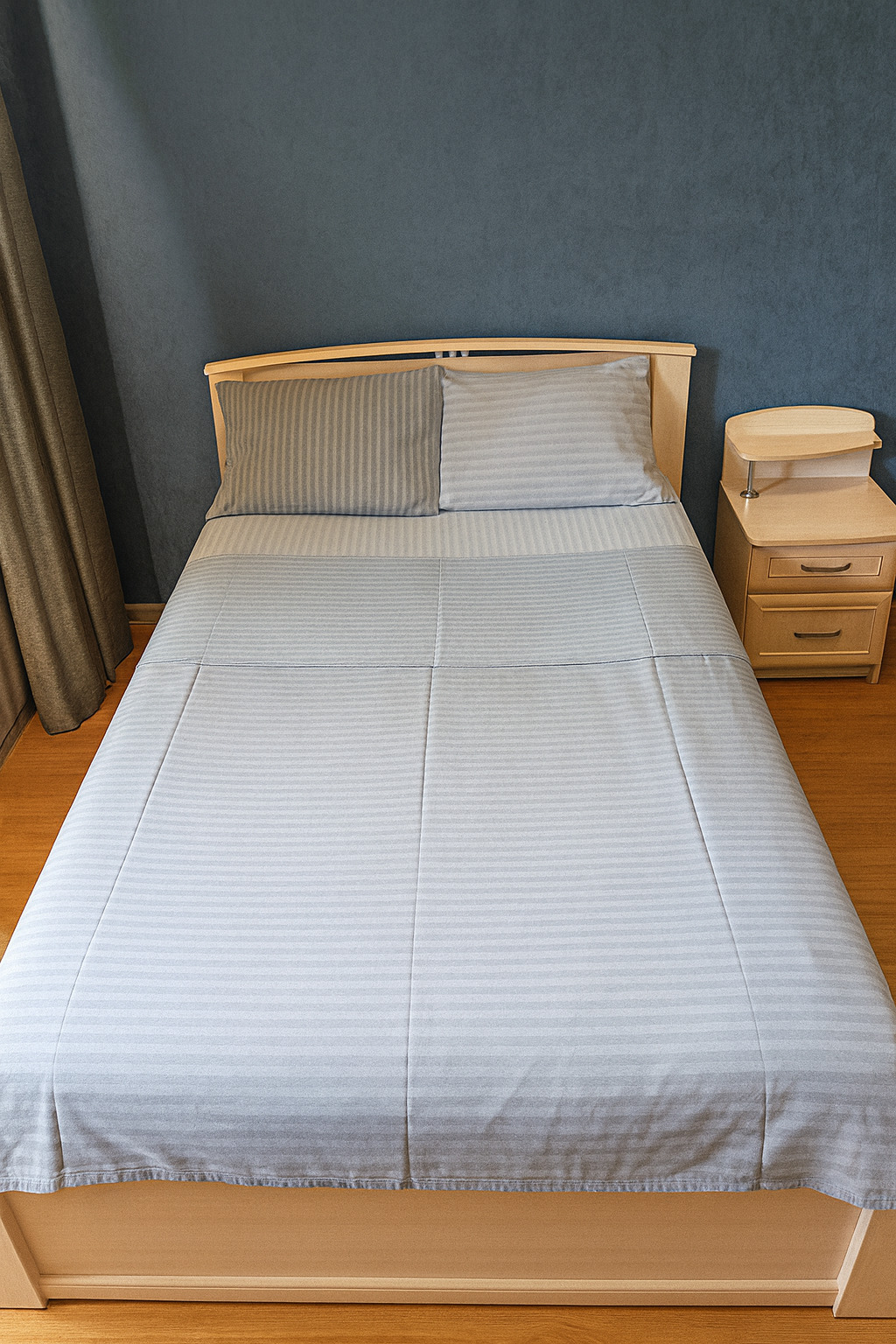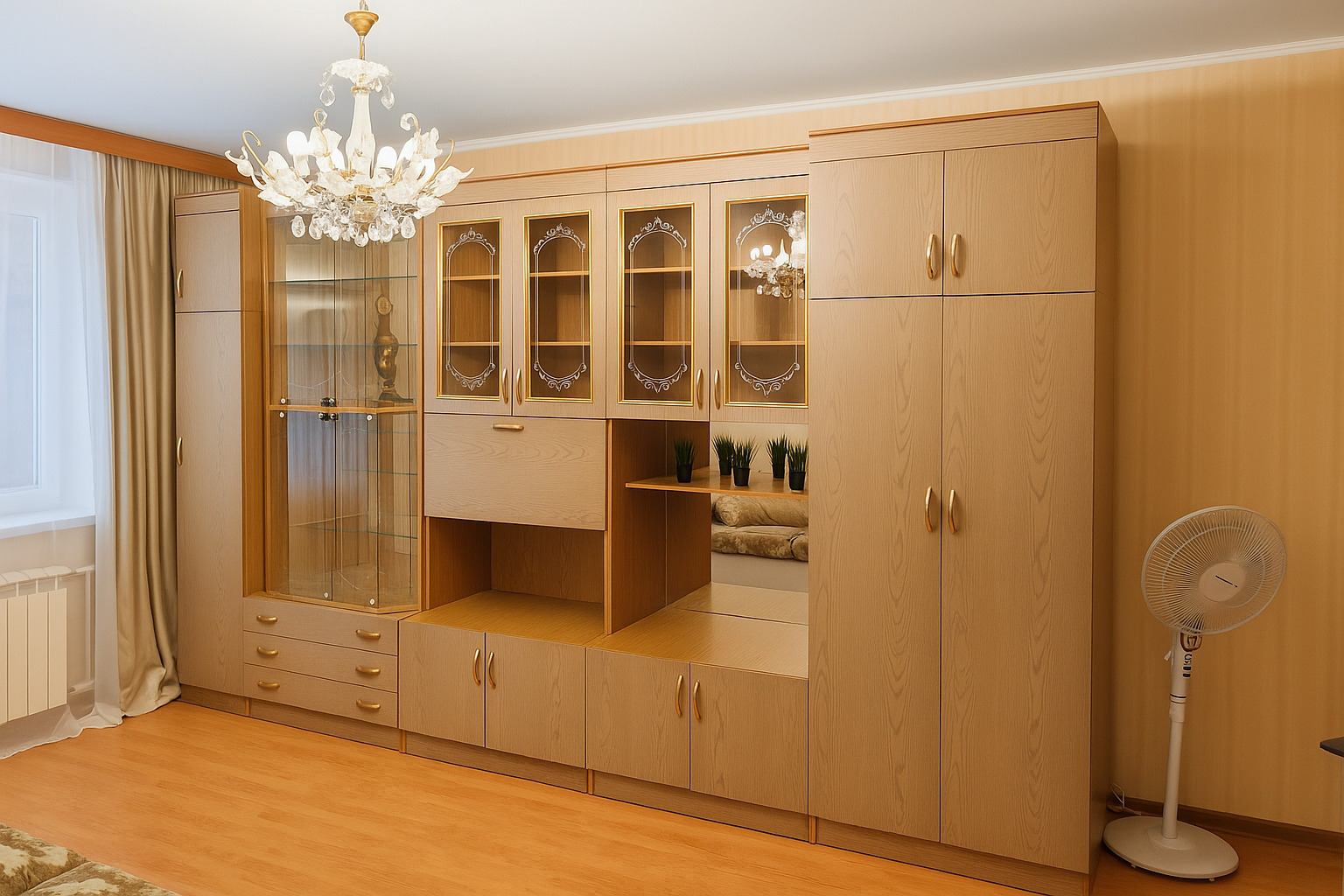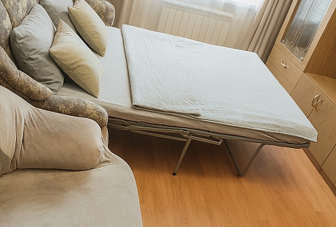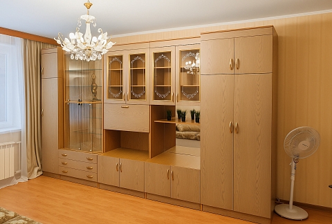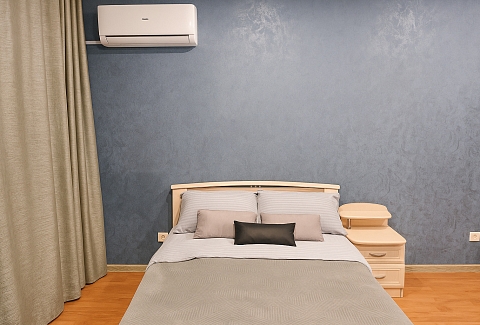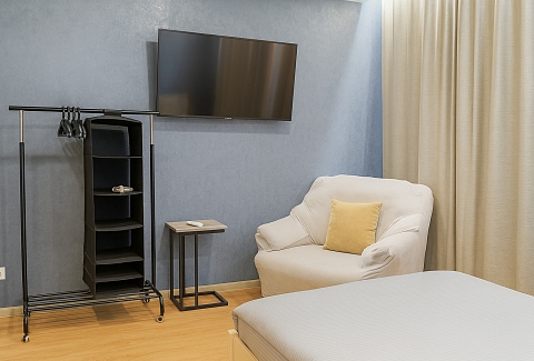В номере: вешалка, диван раскладной, зеркало, кровать двуспальная, стол, стулья, шкаф, кондиционер, микроволновая печь, стиральная машина, телевизор, утюг, холодильник