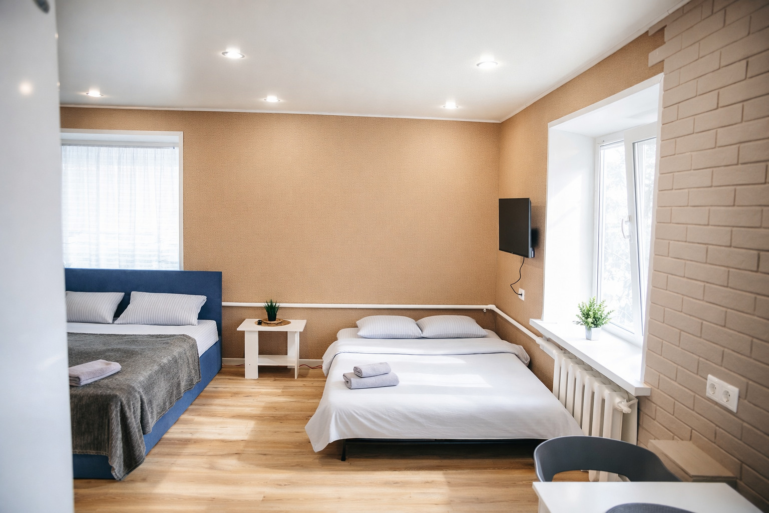 В номере: вешалка, диван раскладной, зеркало, кровать двуспальная, стол, стулья, шкаф, микроволновая печь, стиральная машина, телевизор, утюг, холодильник